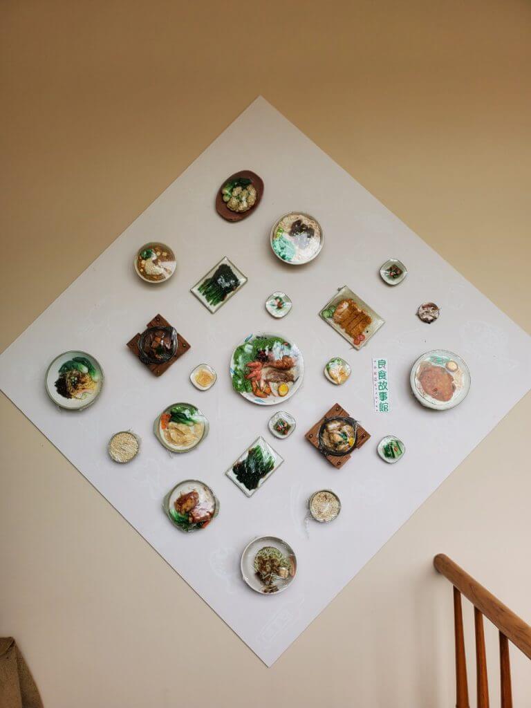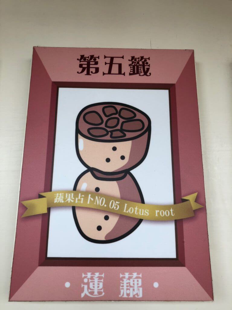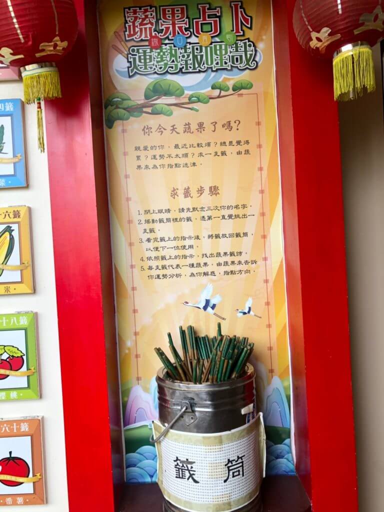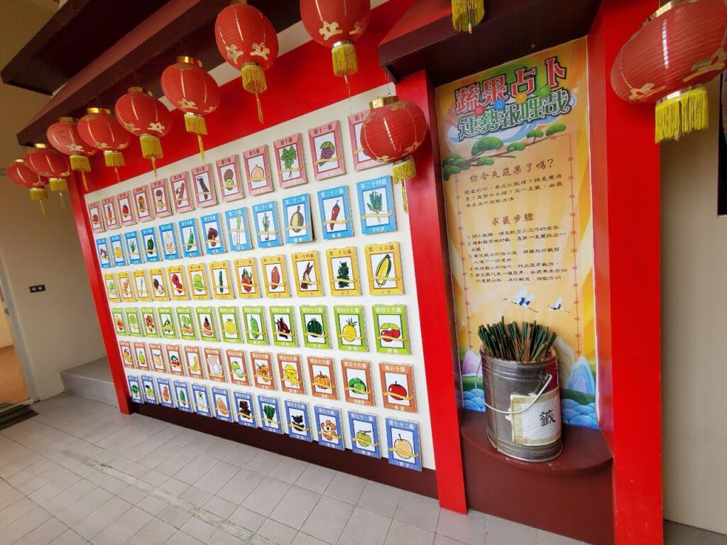 一樓最主要就是他們的廚房,實際能夠參觀的部分,都位在二樓,而要去二樓要從一旁的樓梯上去,在樓梯間還有一面籤詩牆,上面全都是不同的蔬菜水果,非常特別又有趣呢