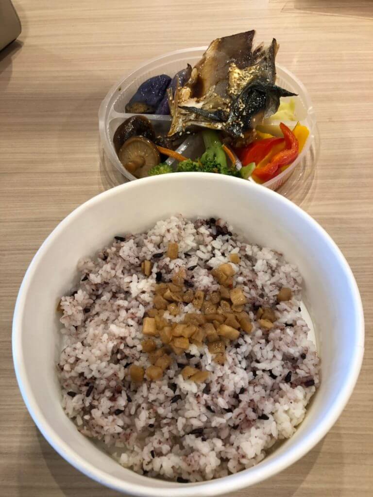 而肚子餓到咕咕叫的小伙伴,則是買了他們販售的「五行特色便當」,素食者也不用擔心,他們也有特別準備素食便當,菜色很豐富外,他們的米飯還是紫米飯,整個營養均衡啊 ~