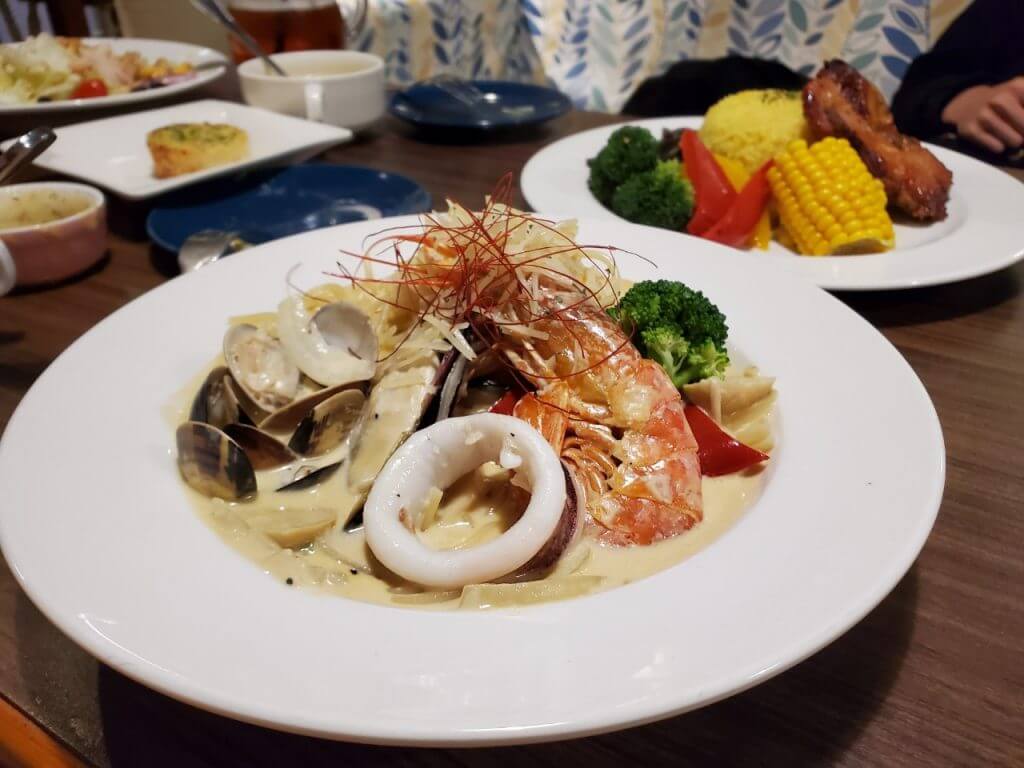而我點的綜合海鮮義大利麵,海鮮用料吃起來蠻新鮮的,麵條QQ的,重點是麵的份量也是一樣好多啊,而小伙伴吃的雞腿排餐也讓他讚譽有加,不過他搭配的飯看起來黃黃的吃起來卻沒有什麼味道,可能就是為了顏色上的不同吧哈哈