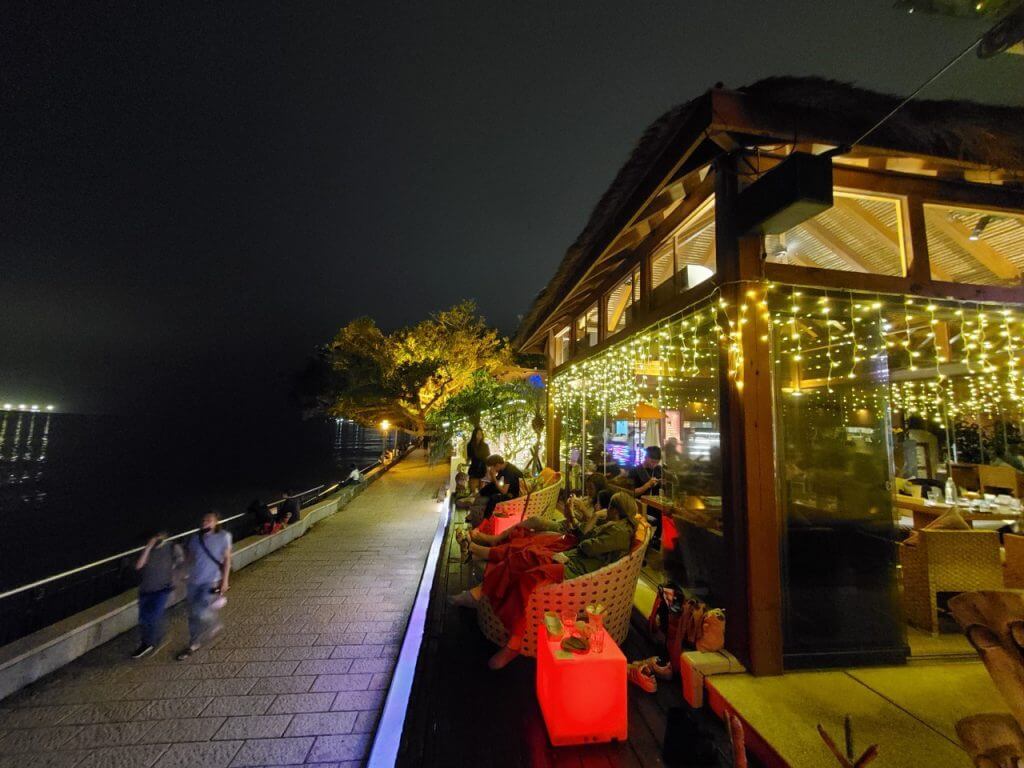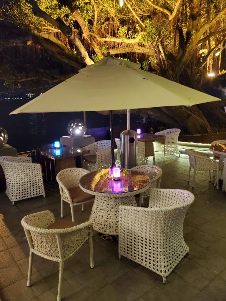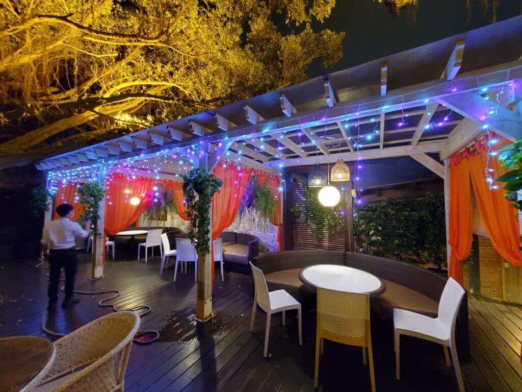 走沒多久就能看到榕堤水灣餐廳的入口,垂墜的LED燈串裝飾,在暗暗的街道上,讓人很難不注意到他的存在,而外面還有一整排的戶外座位區,整體設計上感覺就像是沙發一般,就位在於河景第一排,雖然前面會有人走來走去,但是能夠直接看到夜晚的河景坐在這裡也是一大享受呢