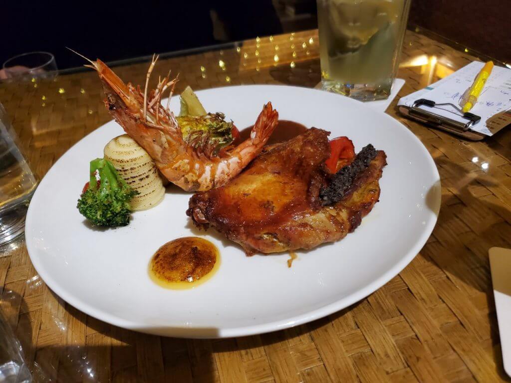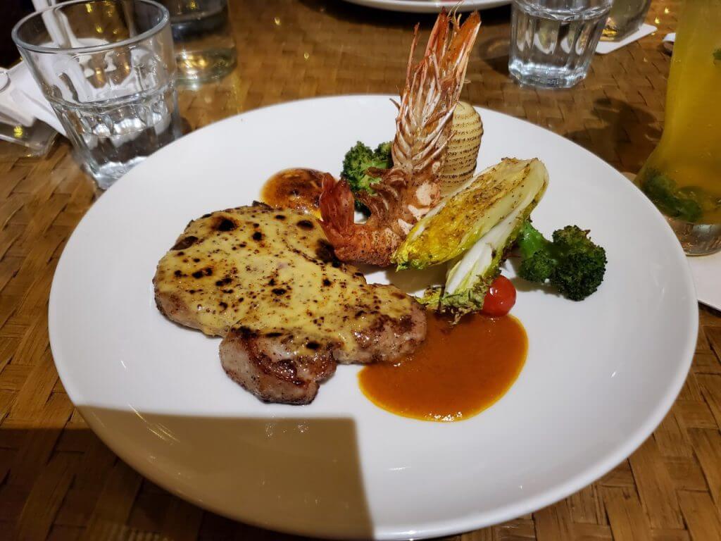 沒多久我們的主餐都送上來啦,我當天點的是厚切豬+大蝦,而小伙伴則是點了雞腿排+大蝦,原本他想點的是「金巴蘭熱火私藏舞串燒」,不過他看到有一整串的鳳梨就頓時放棄,不能接受鳳梨的朋友要特別注意一下啊