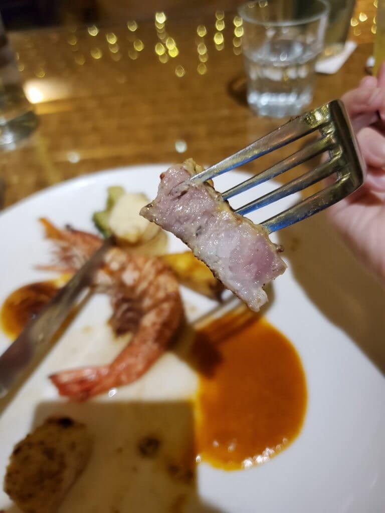 我的厚切豬+大蝦上塗滿了類似蜂蜜芥末醬的醬料,整塊豬排非常軟嫩,而且厚度不算薄,只是吃到後面醬料讓我覺得比較膩,而他一旁附上的馬鈴薯泥塔,是我的最愛之一,吃起來香氣很重而且口感很綿密