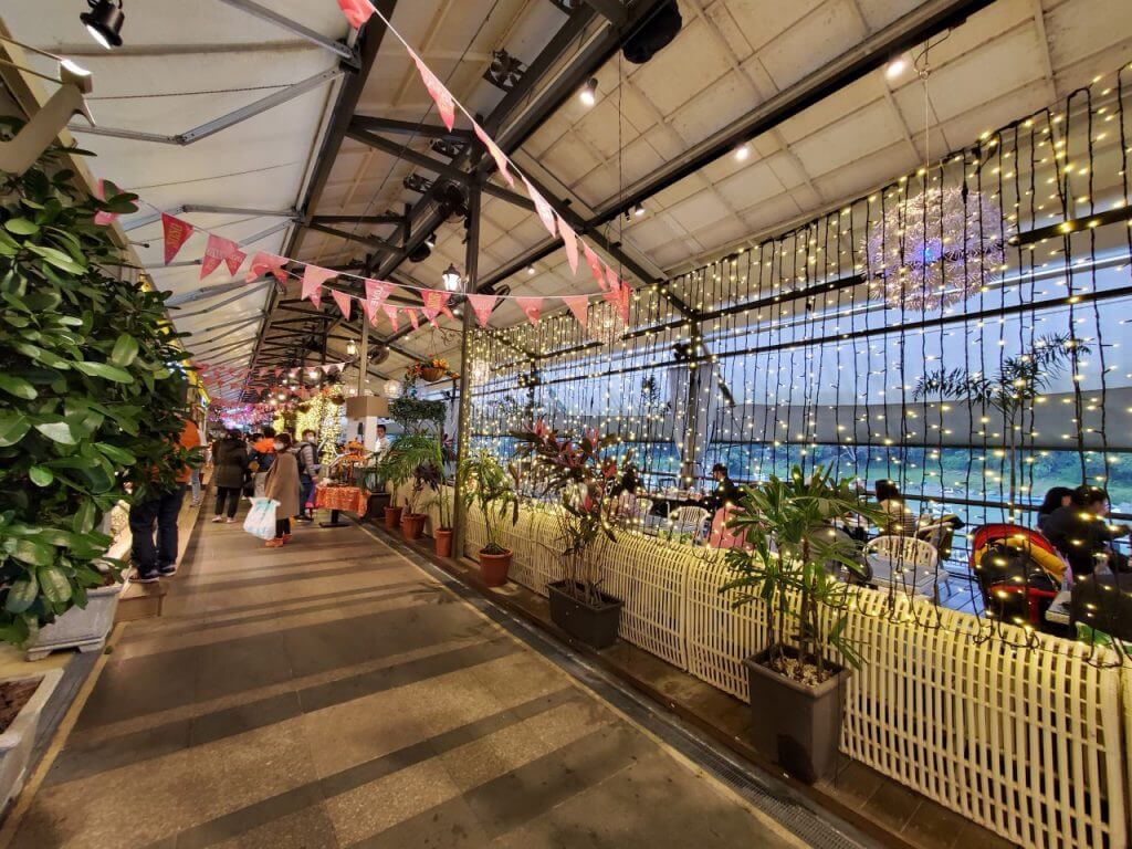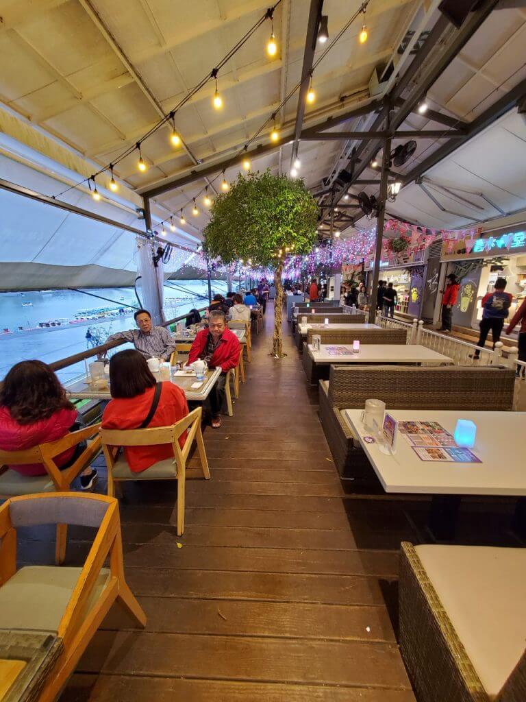 一整排的景觀餐廳上面都有屋簷可以避雨,大家可以很悠哉的坐在座位上欣賞風景,不過如果想要坐在靠河岸的座位區的話,還是建議打個電話訂位,當天看到好多餐廳的位置都被預訂了,是剛好運氣好還有一個位置可以讓我們入座