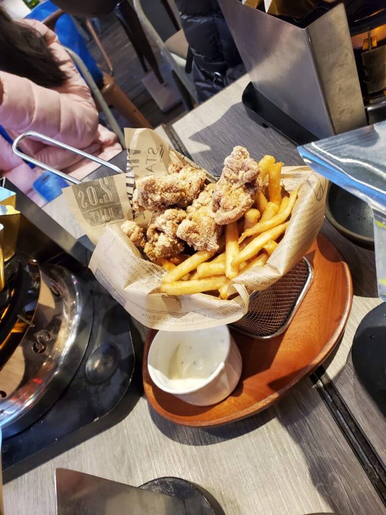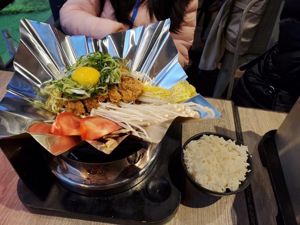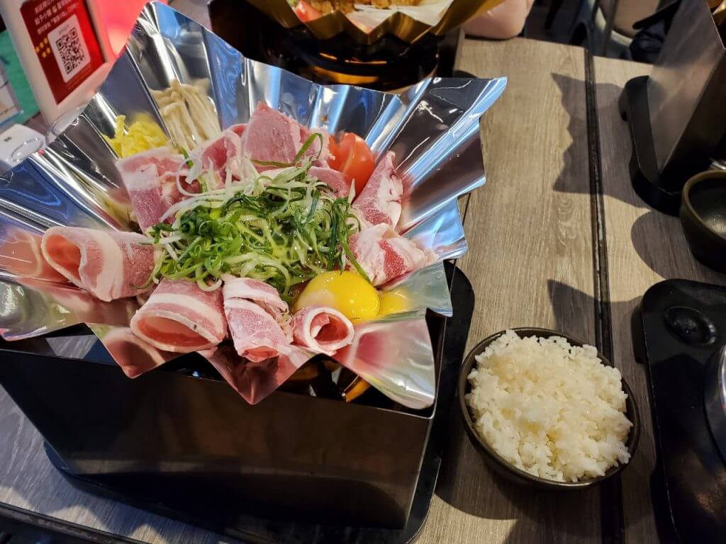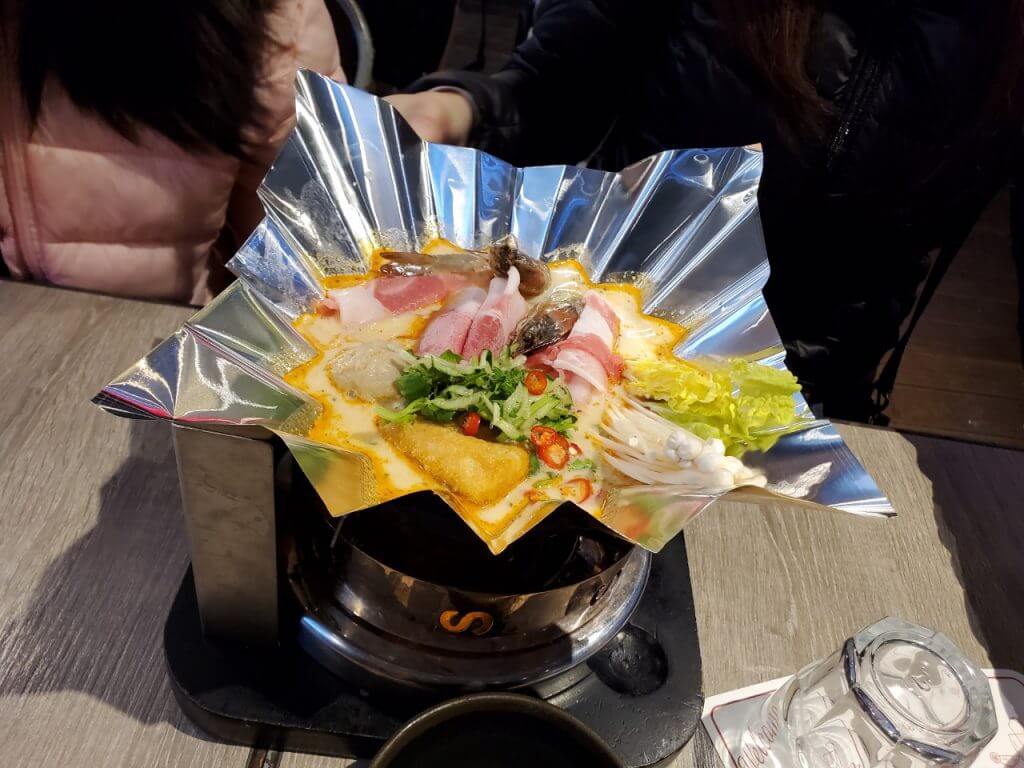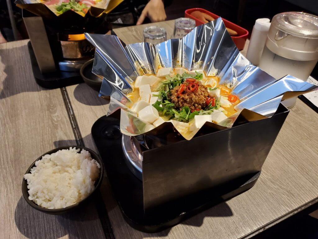 我們點了拉薩海陸手工麵、雞腿排飯、醬燒雪花牛肉以及惡魔打拋辣豆腐,送上來的餐點都需要在加熱過才可以開始吃,很特別的是他並不是用鍋子裝而是使用錫箔紙盛裝我們的餐點,雖然造型上很酷,不過真的要吃飯的時候反而覺得有點卡呢