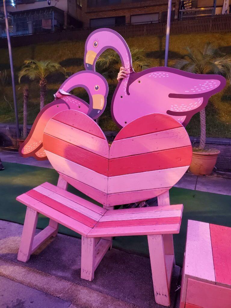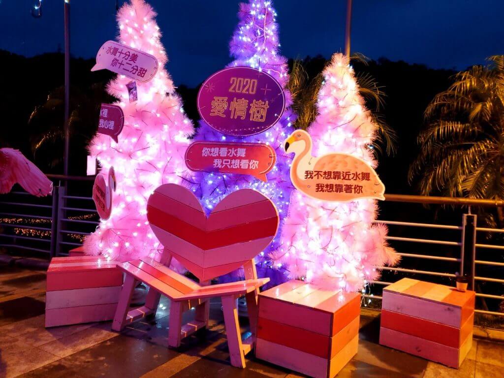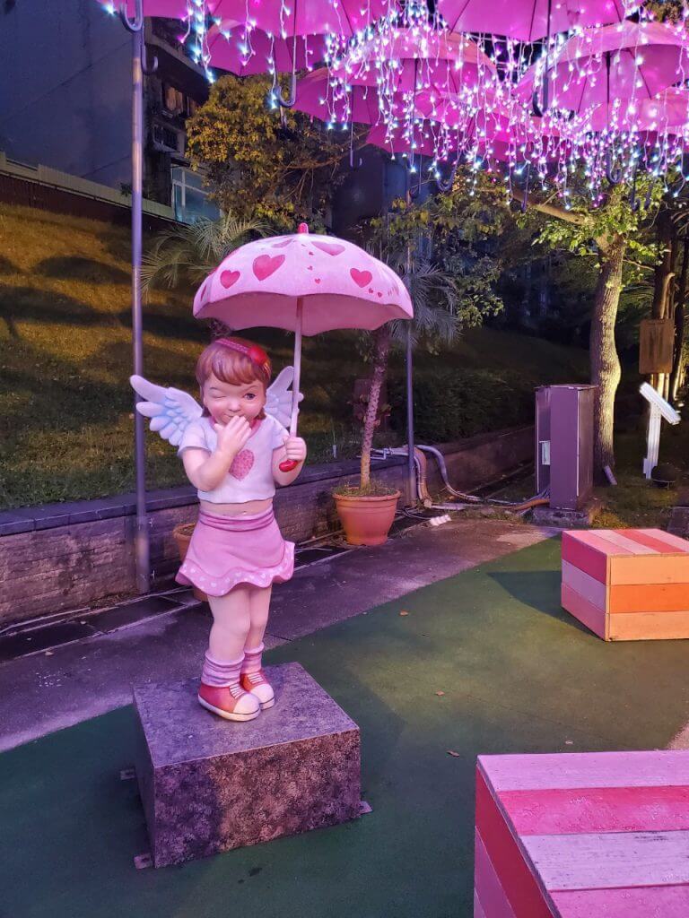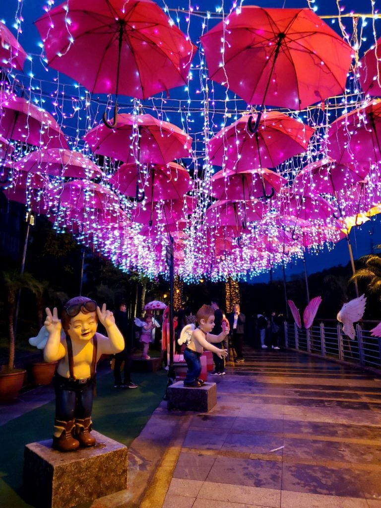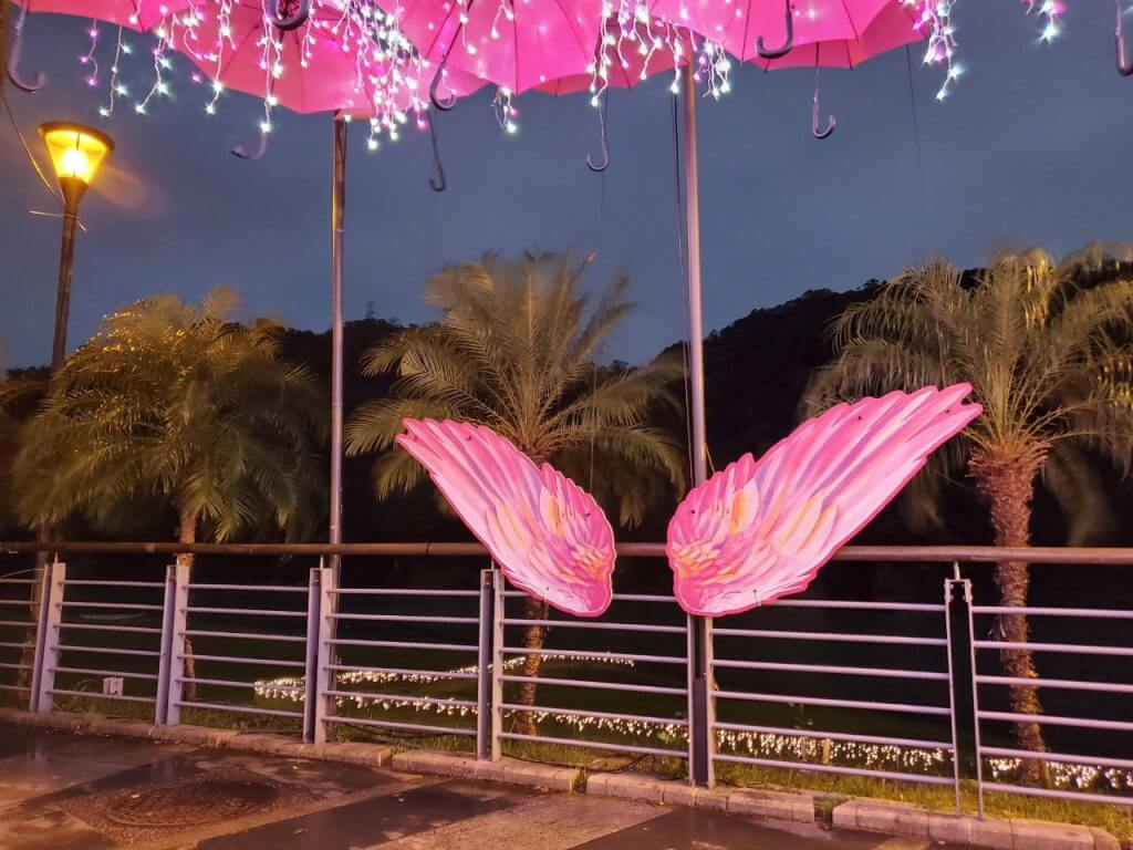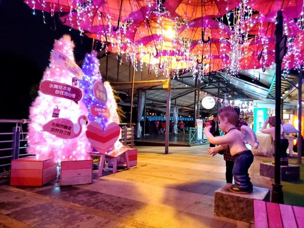 在碧潭的最後方,有一處因為情人節而重新被打造的拍照景點,就是這個,在上一篇也有介紹過的雨傘街,底下的小天使們依舊在原地,不過彩色的雨傘被換成粉色的傘,在掛上LED燈串,又是一個不同的新面貌啊 ~