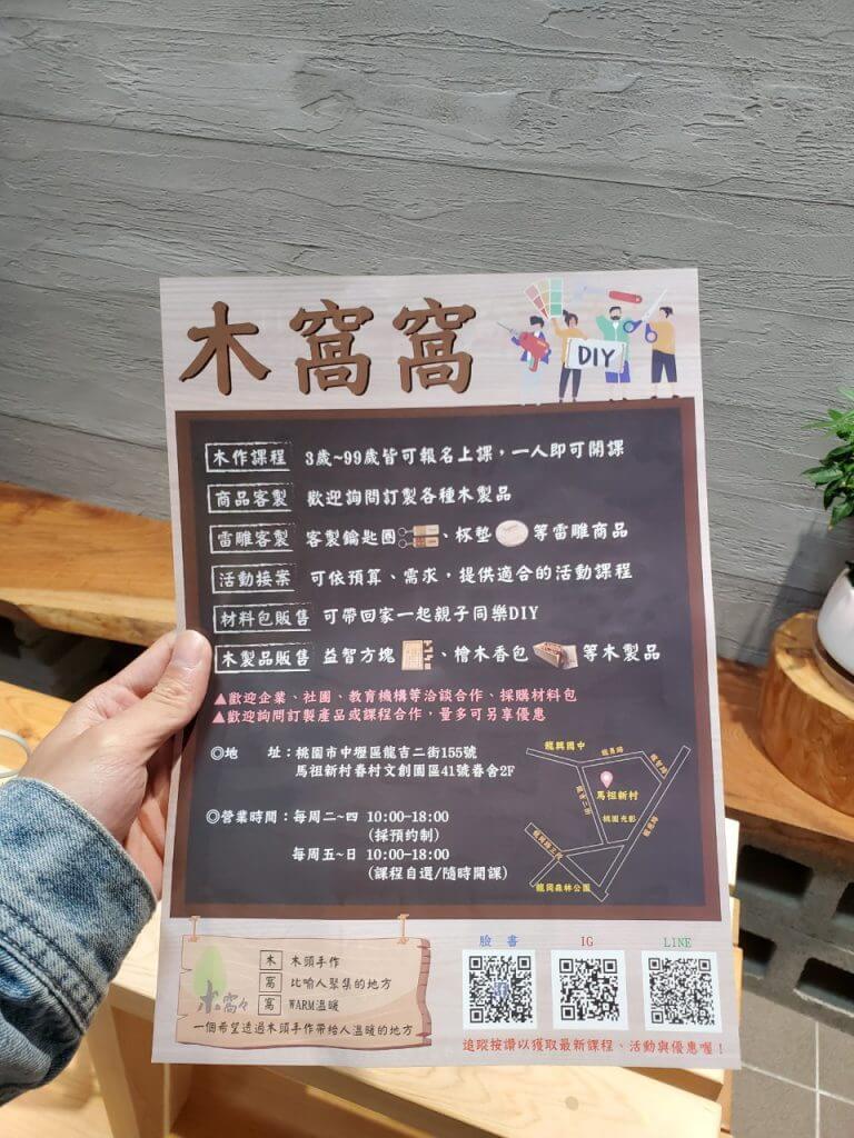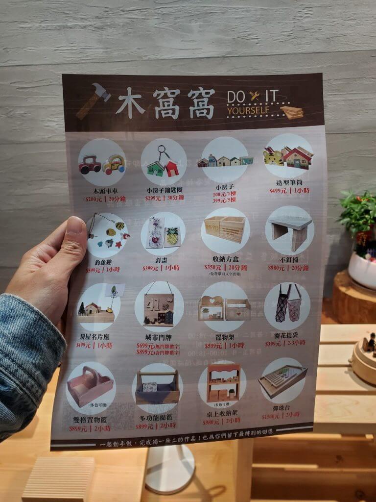 如果對於木工DIY比較有興趣的話,可以到比較裡面一點的矮房,有一間「木窩窩」的DIY課程可以選擇,裡面有好多種品項可以製作,還很貼心的寫上大約製作的時間,只要是3歲以上,都可以報名參加