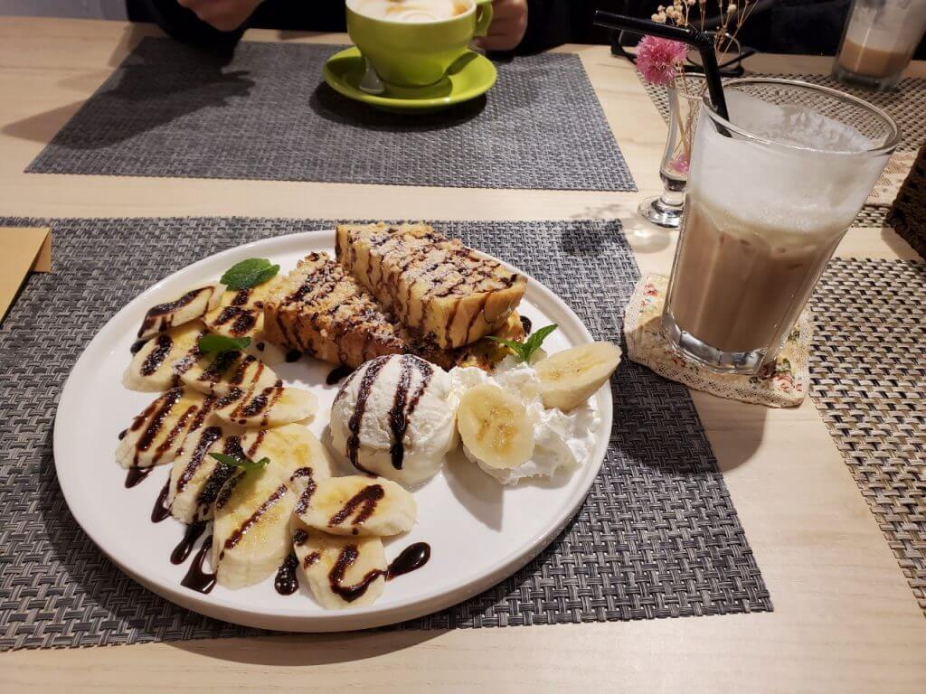 在這裡每個人低消一杯飲品或餐點,我們當天點了雪煉紅茶、拿鐵和一份法式杏仁甜心(香蕉巧克力)