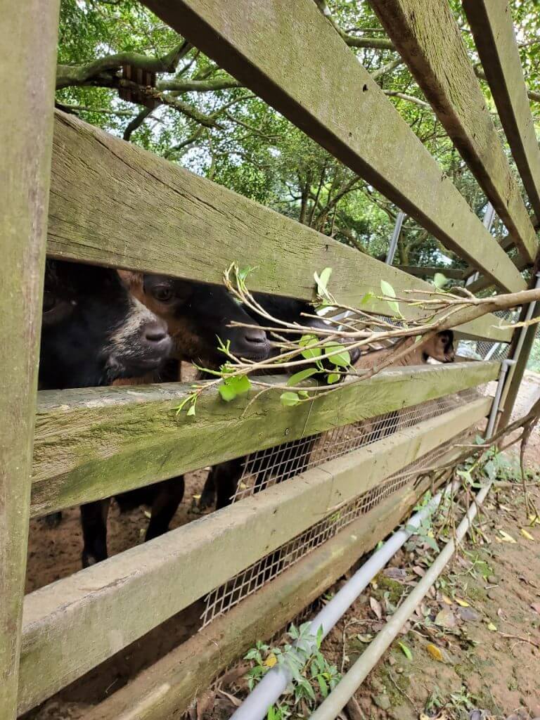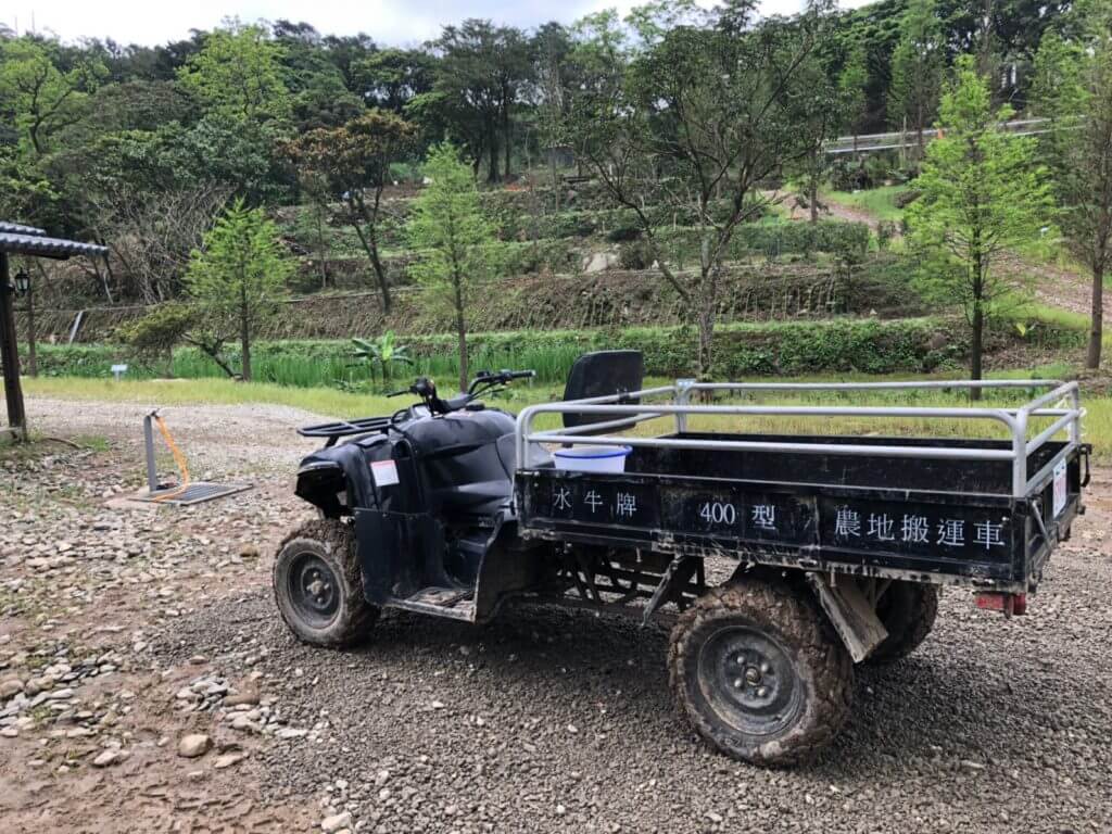 我們換好雨鞋沒多久,剛好有一位工作人員要騎著水牛車上去園區,而我們就這麼幸運的搭著水牛車一起上去直接到餵食的動物區,在現今的社會光是要看到水牛車就已經很難了,我們還可以坐,對我們來說真的是一大體驗呢