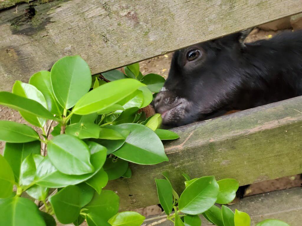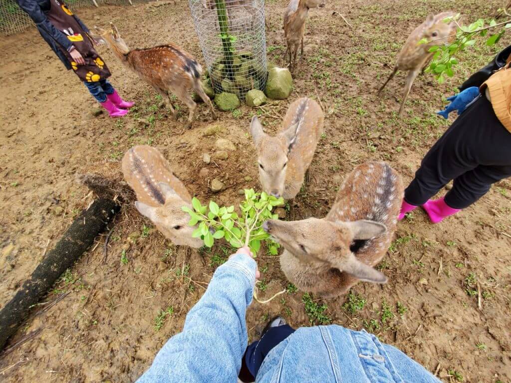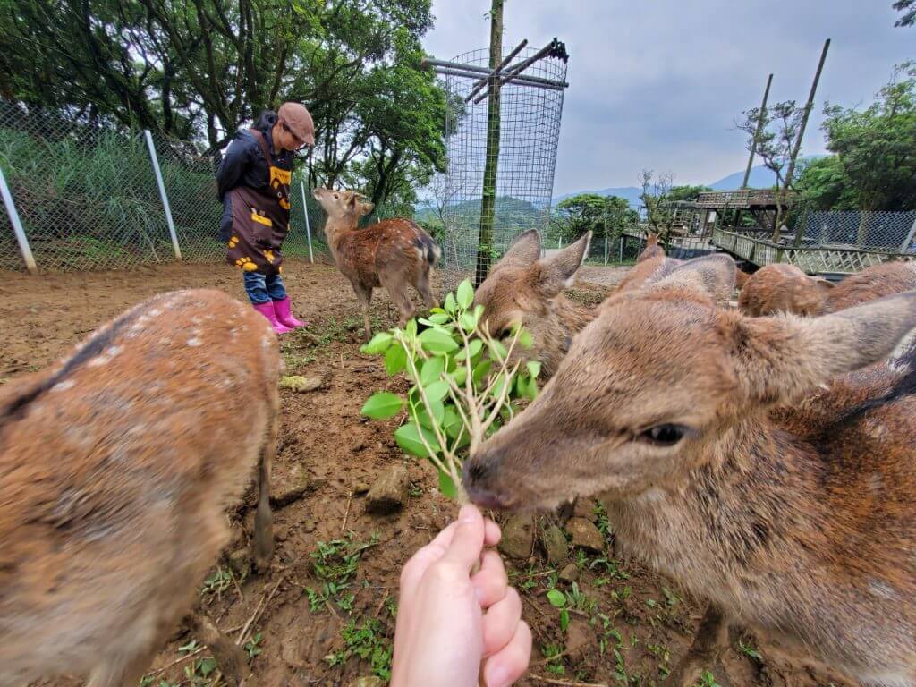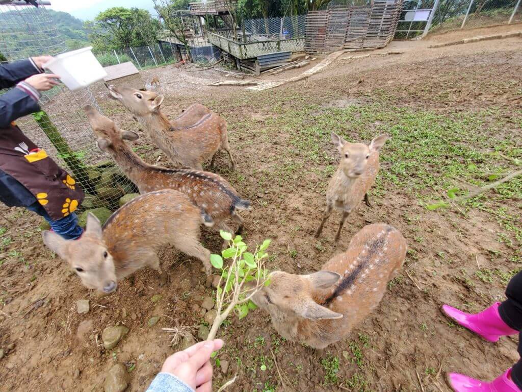 不意外的,梅花鹿們都比較喜歡味道比較重的飼料,而我們手上的葉子他們並不太捧場,真是一群挑食的小鹿們,不過還好,這些葉子外面的跳跳羊也可以吃,工作人員就讓我們重新回到跳跳羊的區域,將這些葉子餵完
