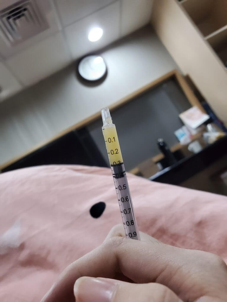 既然親餵母乳現在還沒有辦法,護理師在我們回房間前教了我用手把初乳給擠出來,還給我一支針管收集,於是回到房間後,我便開始我的擠乳初體驗