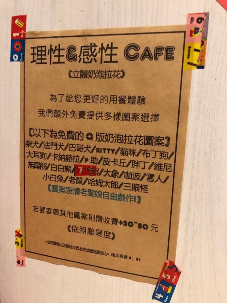 菜單的品項不多,倒是可以做成立體拉花的圖案很多,如果要做除了列出來的圖案,需要另外加價,卻不會加價太多,而且免費製作的選項也很多