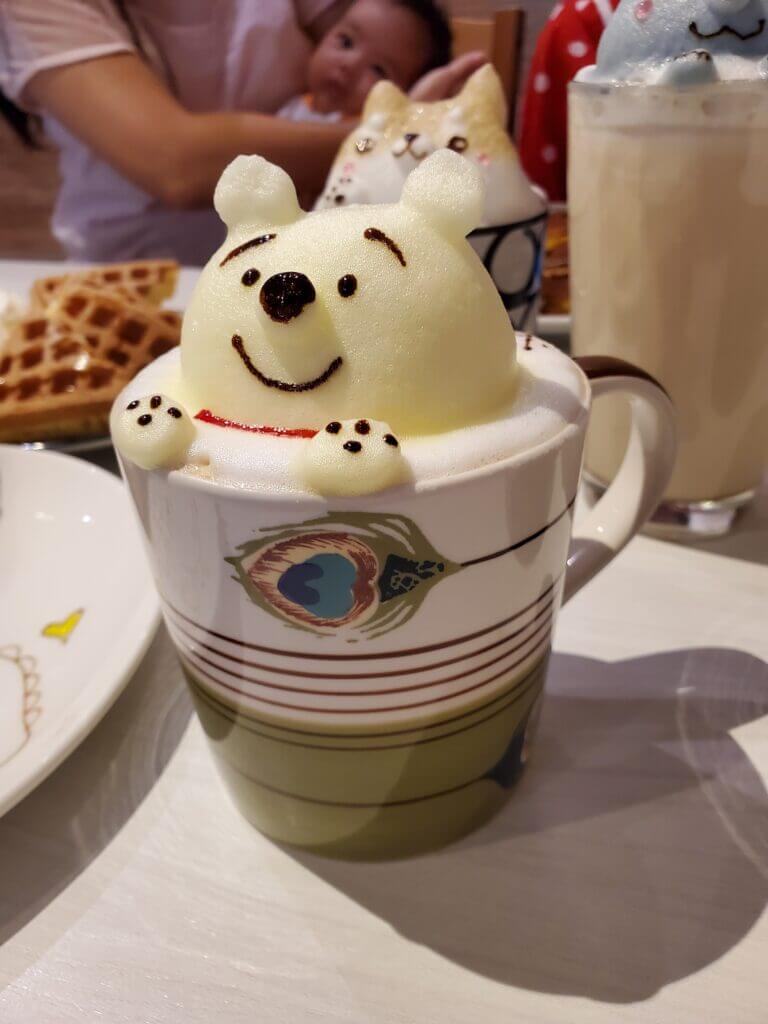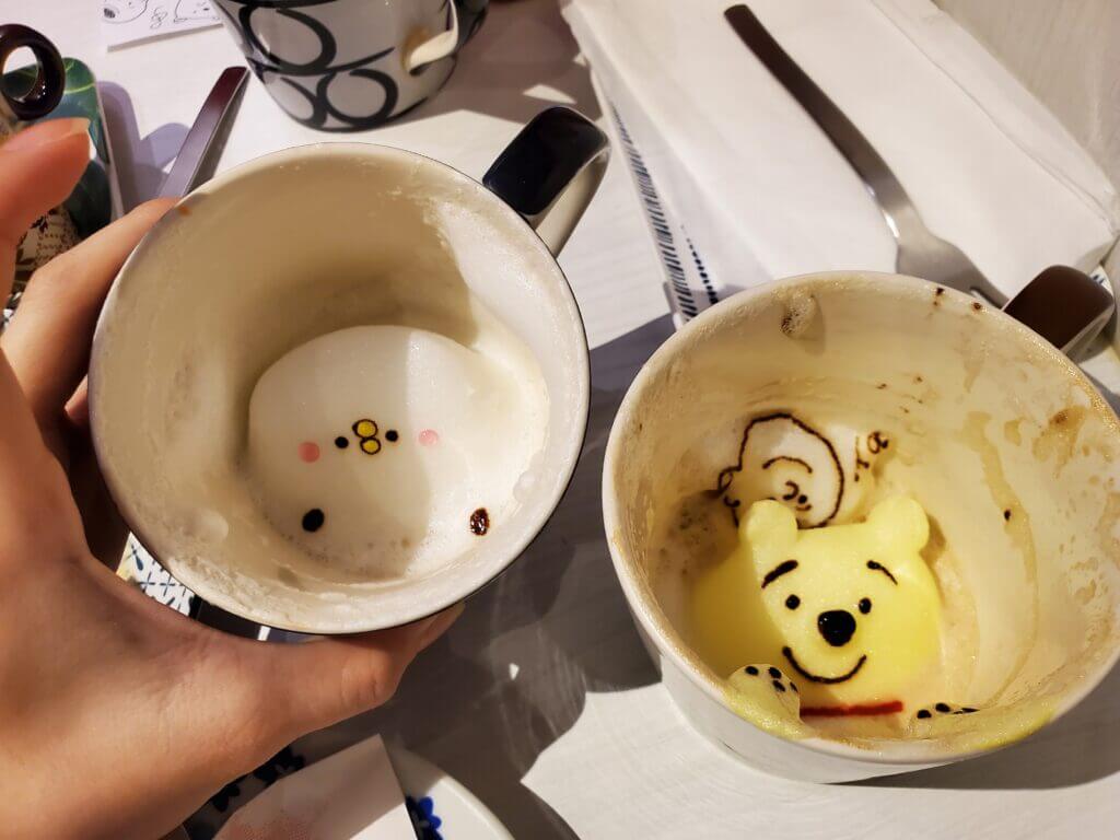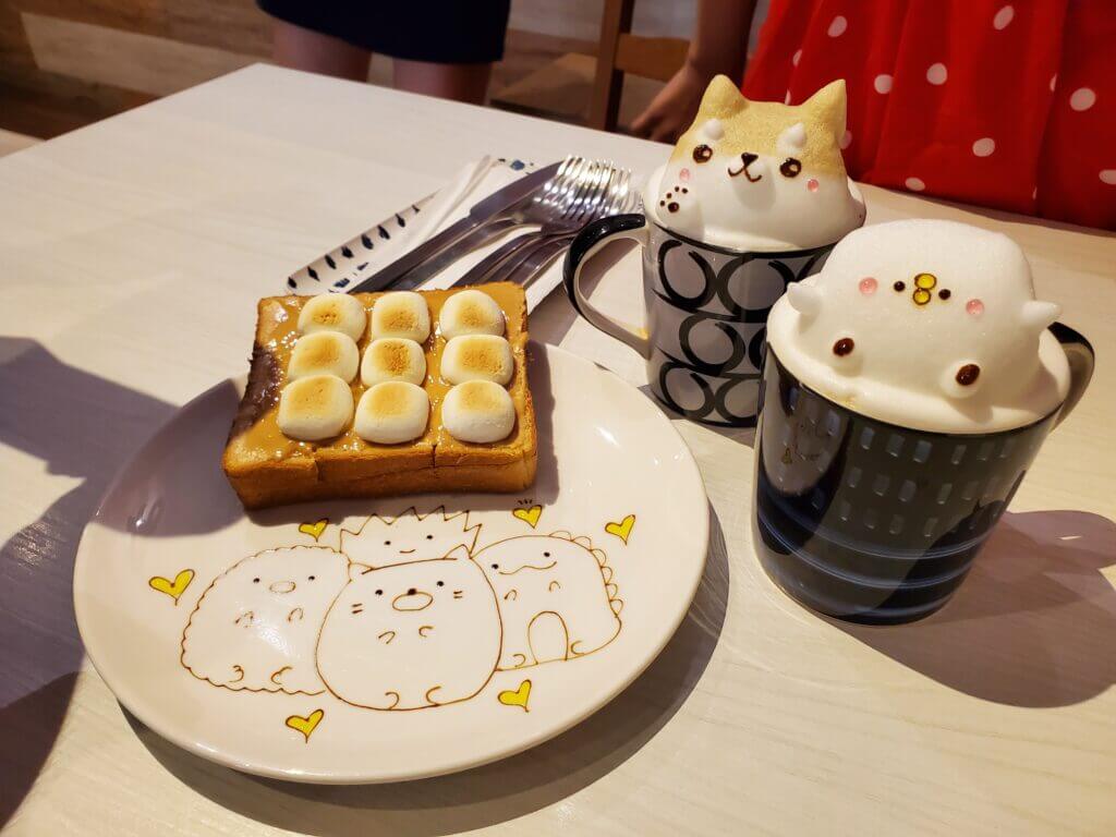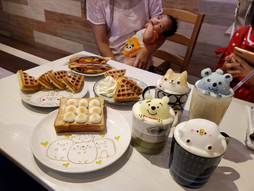 從一開始上來的p助到最後的維尼,每一道餐點上來的時候我們都感到驚喜,原本以為只有飲品這麼可愛沒想到在鬆餅和棉花糖厚片的盤子空白處都還用巧克力醬畫上了卡通圖案,小跟屁蟲看到巧克力醬畫成的角落生物都驚呼了起來