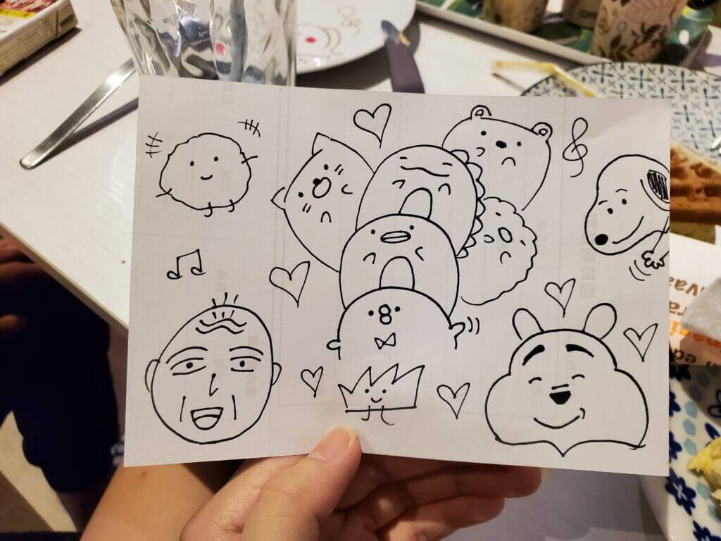 也許是剛剛小跟屁蟲的驚呼吸引了老闆和老闆娘的注意,還送了一張他們自己畫的塗鴉送給小跟屁蟲,又拿了4杯花茶來招待我們,淡淡香氣,喝起來很順口