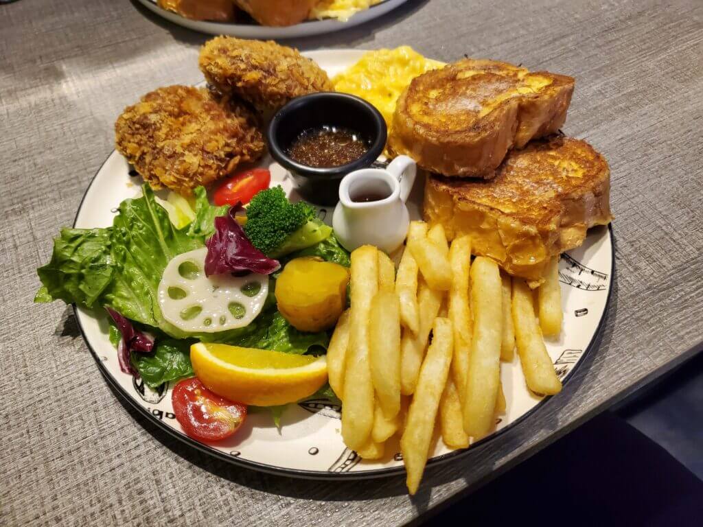 早午餐系列的盤子都被塞的滿滿的,有厚切法式吐司、薯條、歐姆蛋以及沙拉等等,是一道多樣化份量又多的餐點,適合幾個人一起分著吃,只是漢堡排和我想像的不一樣,吃起來有點偏乾,肉的味道也有一點點重