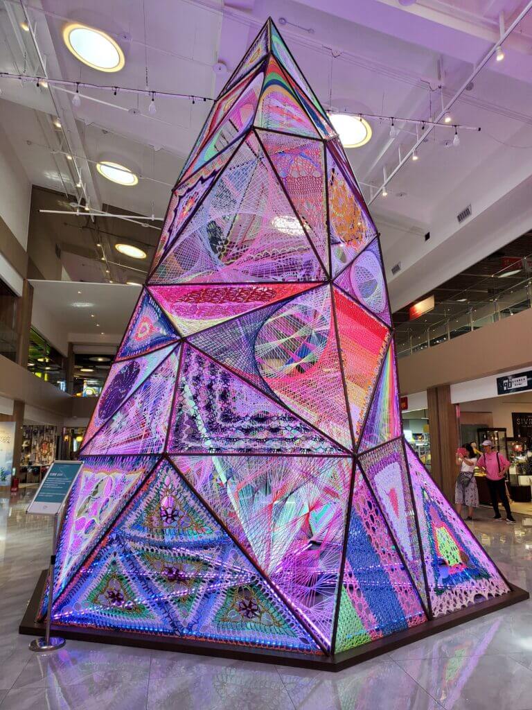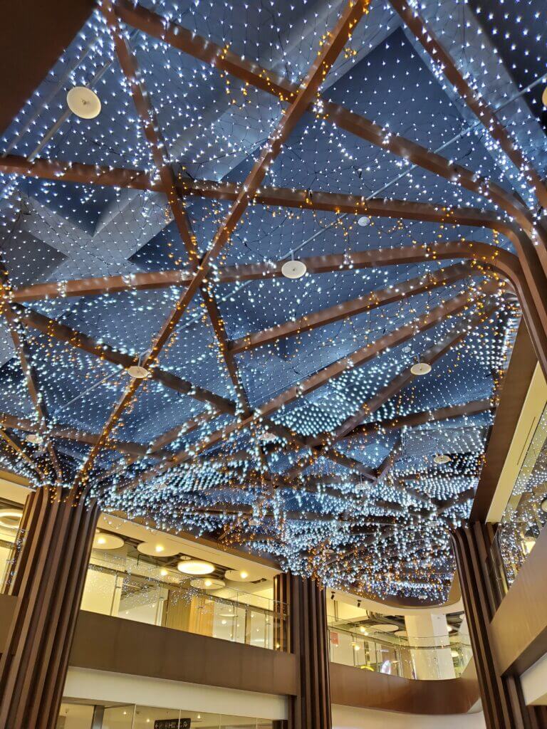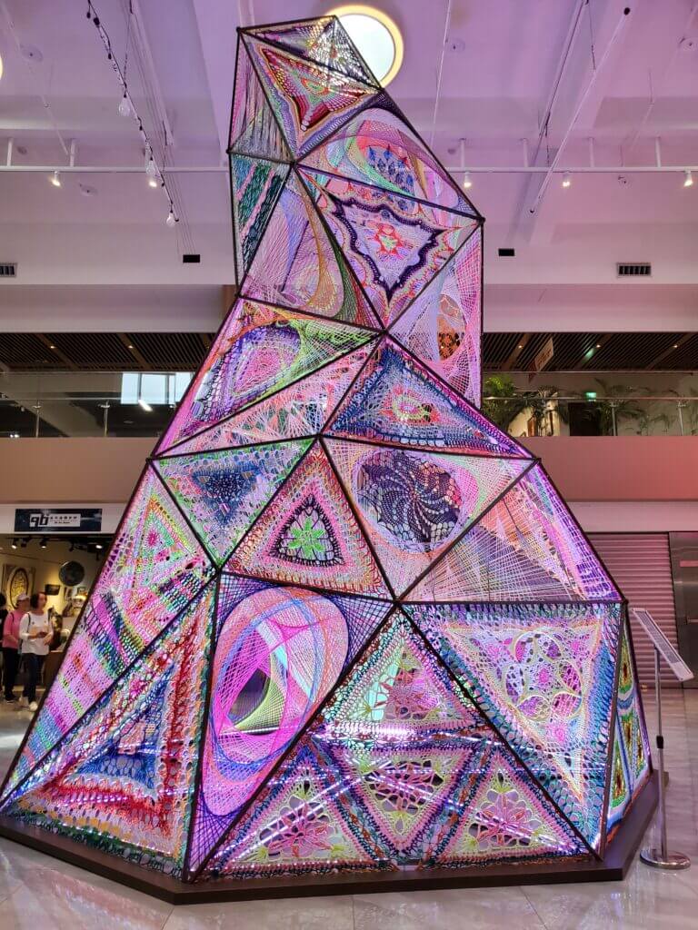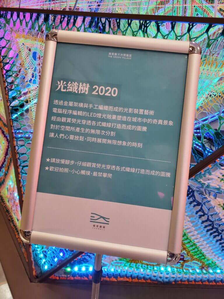 在一樓大廳最吸引人注意的就是兩層樓高的「光織樹」,是經由觀賞螢光穿透各式織線打造而成的圖騰,每一種角度看起來都不太一樣,有一種說不出的美
