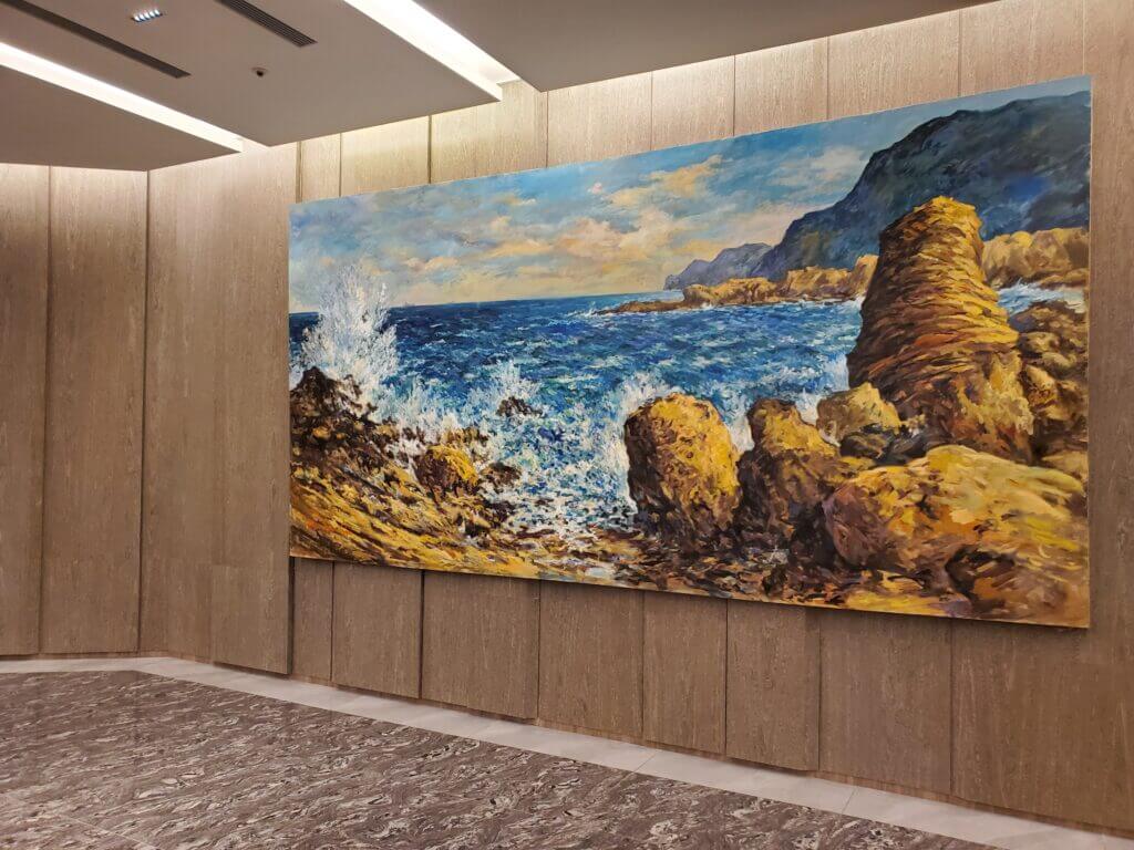 在滬尾藝文休閒園區的走廊上,隨處可見一幅幅畫作,有各式各樣的風格,有一幅海岸邊的海浪,看起來超級真實,磅礡的氣勢都展現出來了