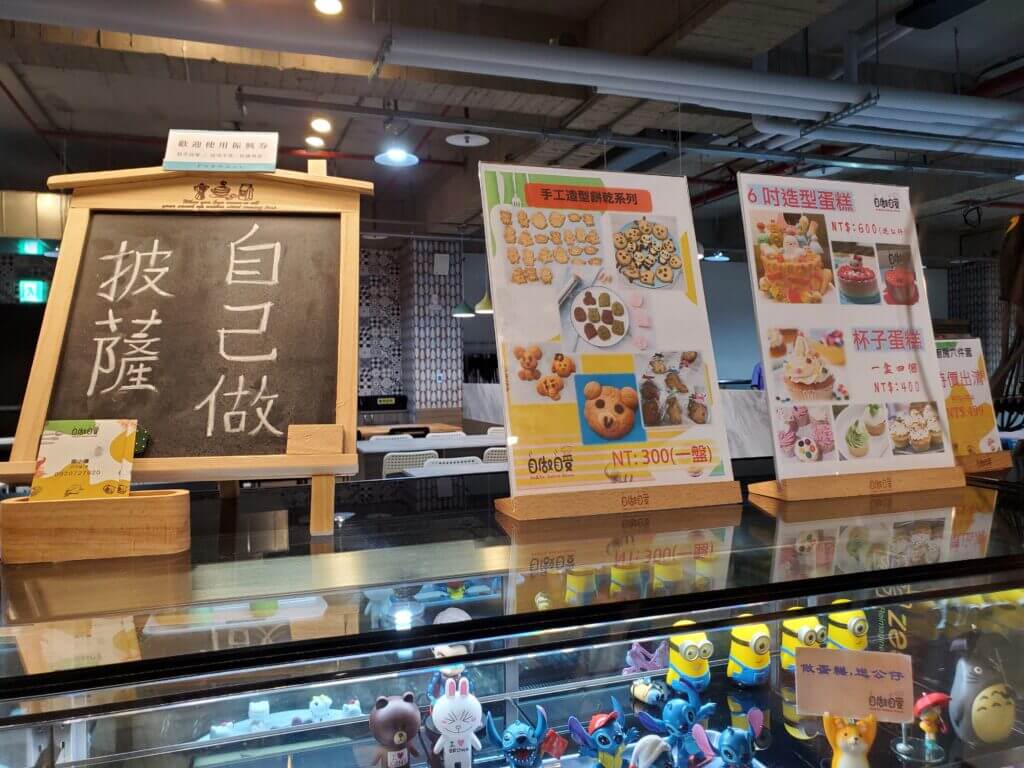 我們來到二樓就先被一家「自作自受烘焙坊」吸引目光,翻了一下菜單,原來這裡是DIY餐廳耶,可以手作的餐點除了常見的披薩外,還有義大利麵、餅乾、造型蛋糕等等