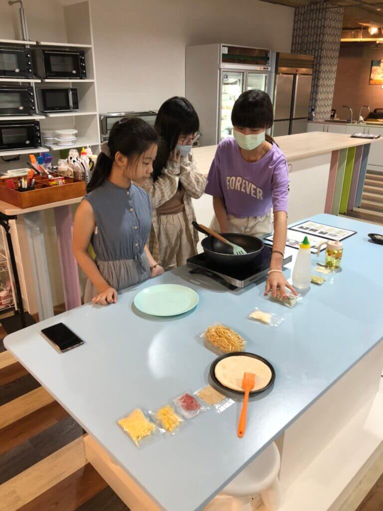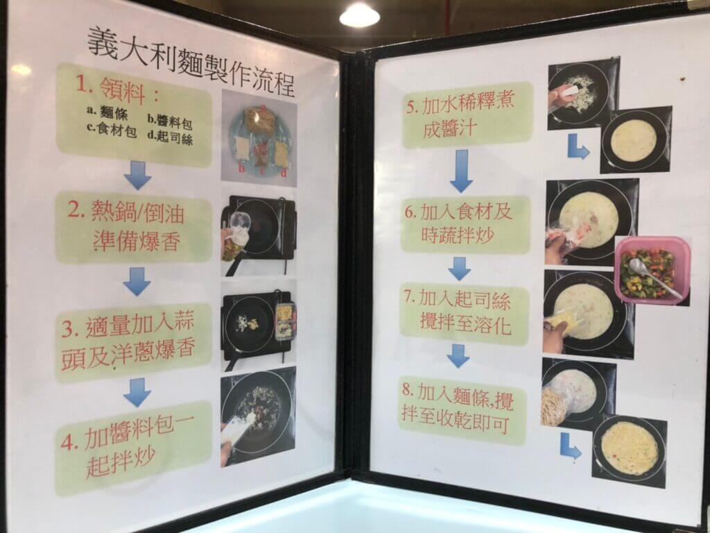 我和小跟屁蟲一人體驗一個,小跟屁蟲是披薩,而我則是義大利麵,對於是廚房菜鳥的我,感覺是一大挑戰啊!還好工作人員在旁邊一個步驟一個步驟的教我們,一旁還有步驟流程可以參考,能夠確保煮出來的東西不會是黑暗料理了