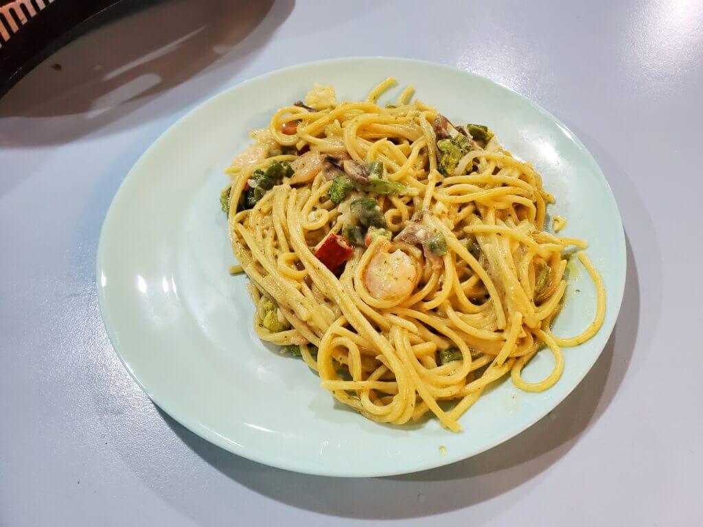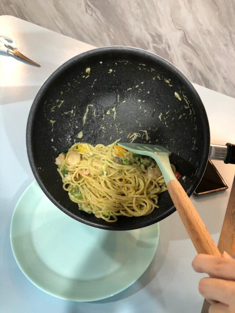 爆香-加醬料-加料-拌麵-收乾,一氣呵成整個過程不用20分鐘吧,超級快速,義大利麵煮好還有模有樣的,瞬間讓我成就感爆棚啊 ~