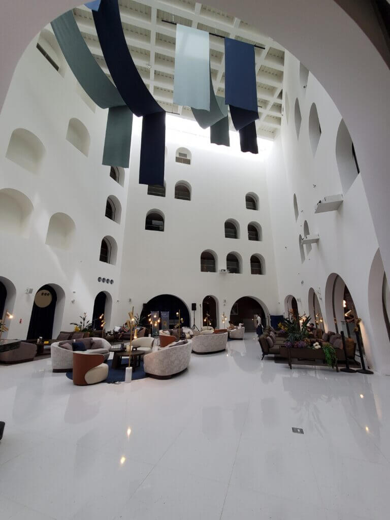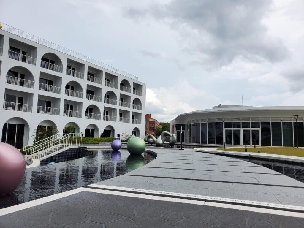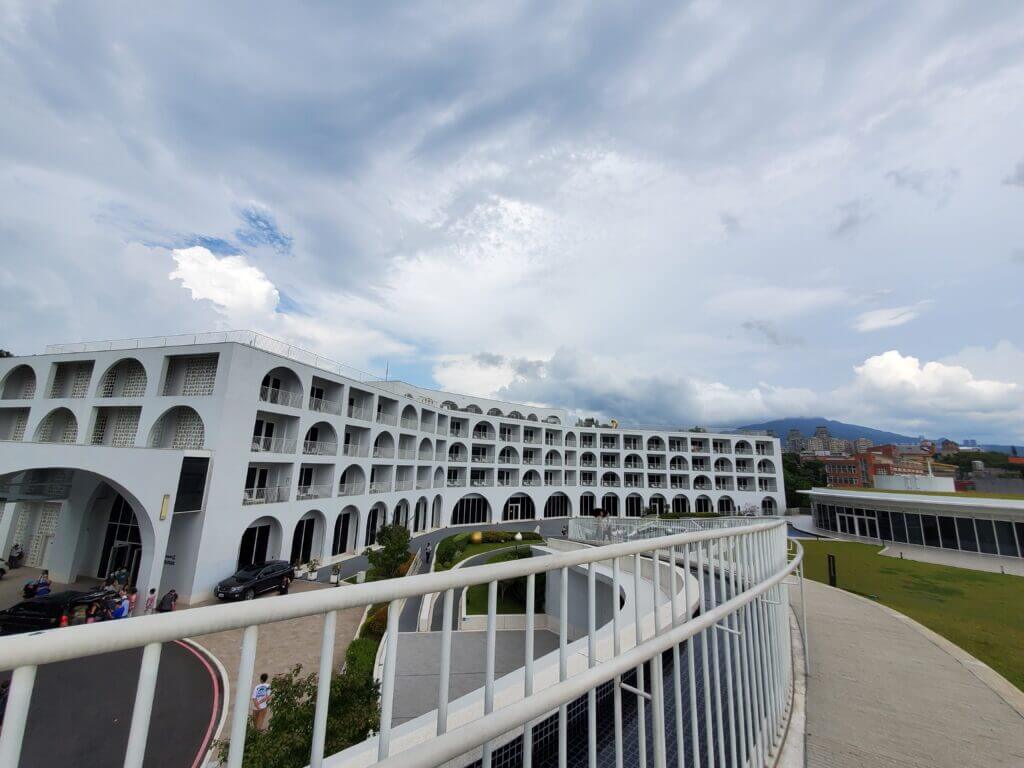 從大門走出去,映入眼簾的是純白的希臘建築,瞬間拿起手機猛拍,只可惜今天天氣沒有很好,如果是藍天白雲的話,拍起來的畫面肯定會更加好看