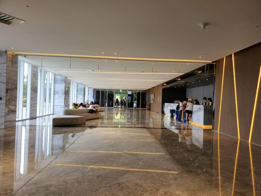 因為疫情的關係,停車場的電梯只能搭乘到1樓,要進去廣場裡面,也需要量體溫、戴口罩和酒精消毒,量完體溫工作人員會給你一張藍色的小貼紙,好像入場券一樣