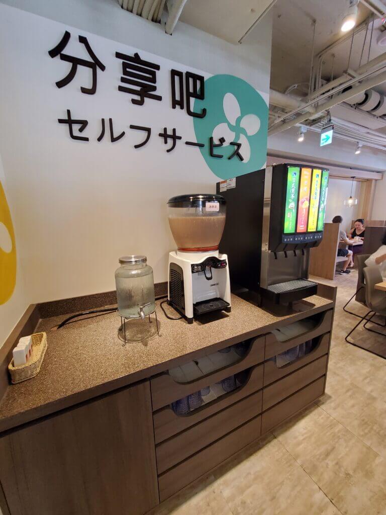 入座後,服務人員會送上菜單,不過點餐是使用桌上的平板點餐,飲料吧的部分也是自助使用,除了有常見的日式煎茶和奶茶外,竟然還有芒果汁可以喝,而且喝起來是順口的,讓媽媽當天一直續杯