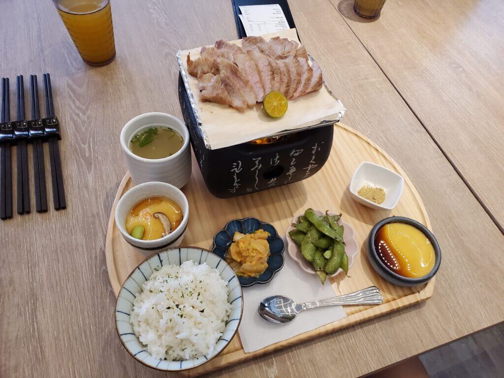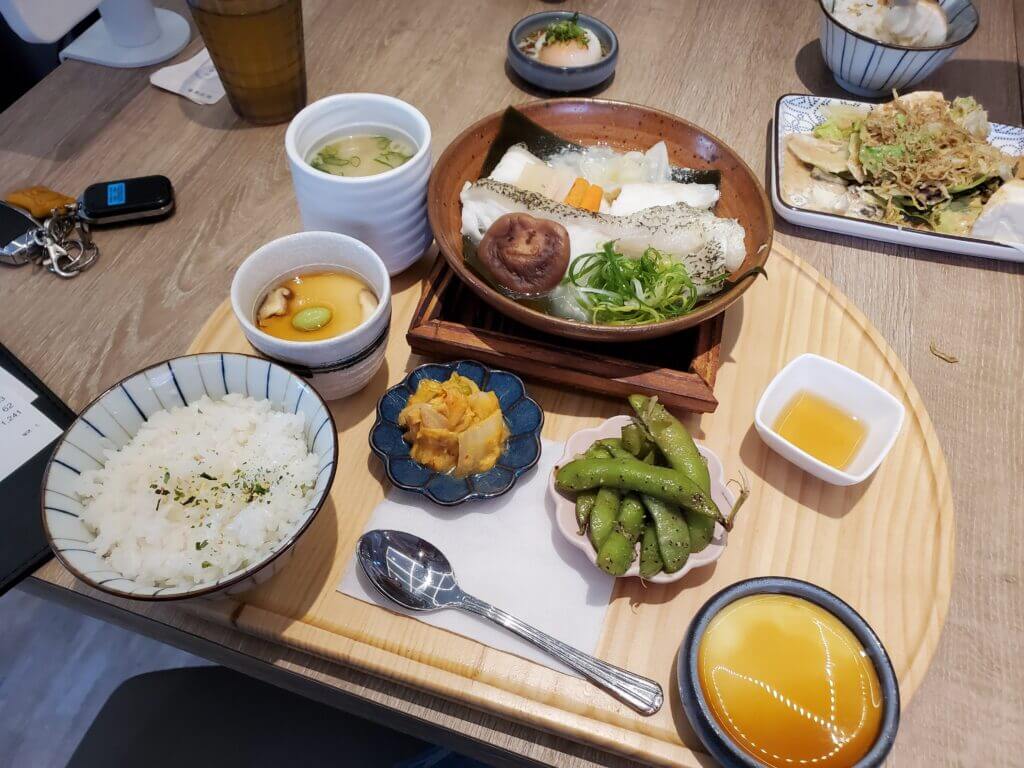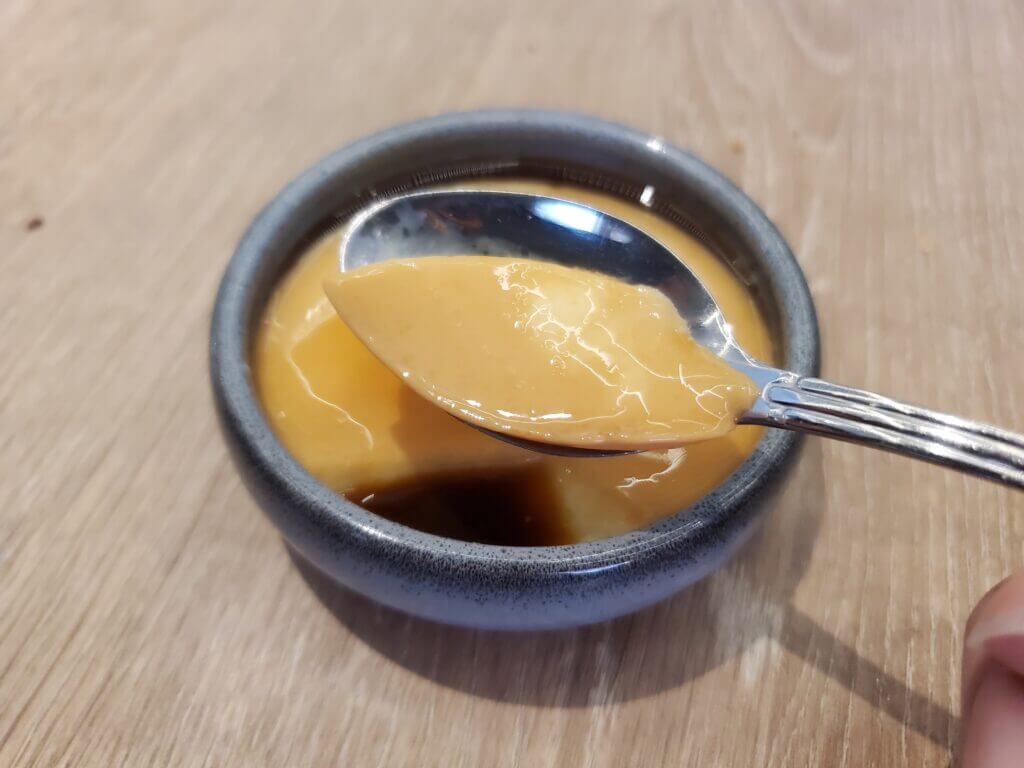 每一份定食都有附上毛豆以及甜點布丁,毛豆吃起來爽口開胃,讓我比較驚豔的是附上的布丁,吃了一口,馬上就有濃濃的雞蛋香,在搭配上黑糖醬,整體滑順不膩口,不會過於甜,是大人小孩都會喜歡的布丁