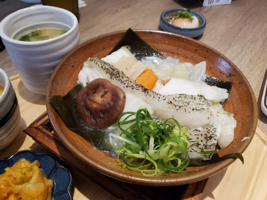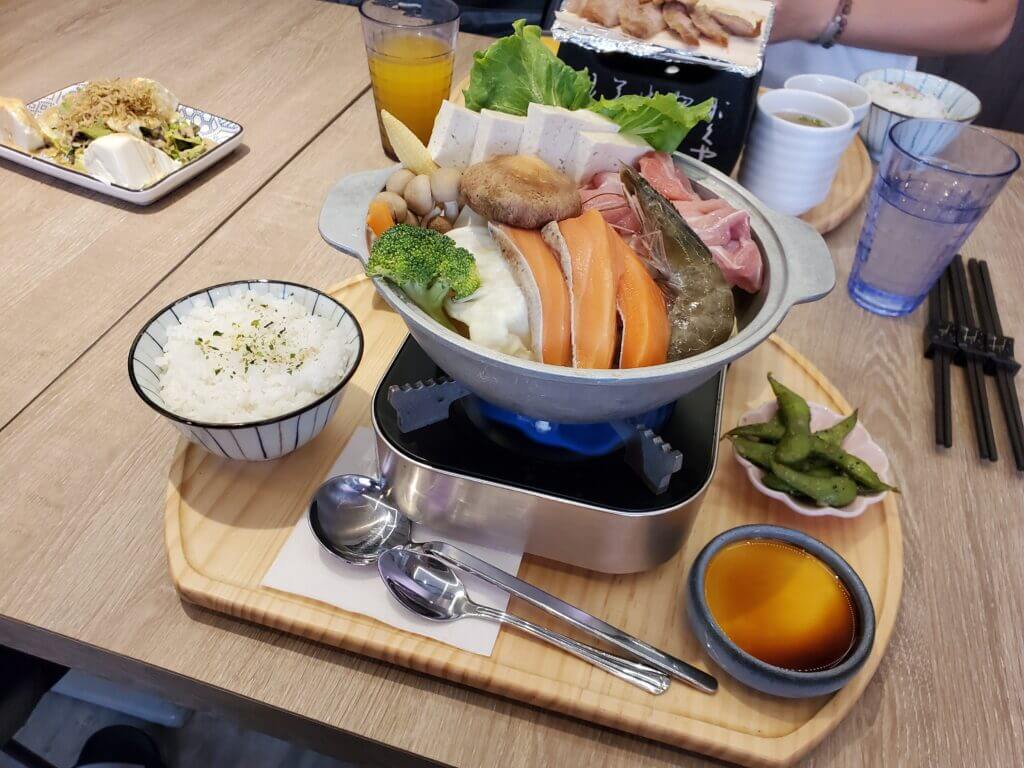 很少會在日式定食店看到火鍋,裡面食材非常豐富,有鮭魚、蝦子、雞肉以及蔬菜等食材,剛送上來時還是生的,要自己加熱
