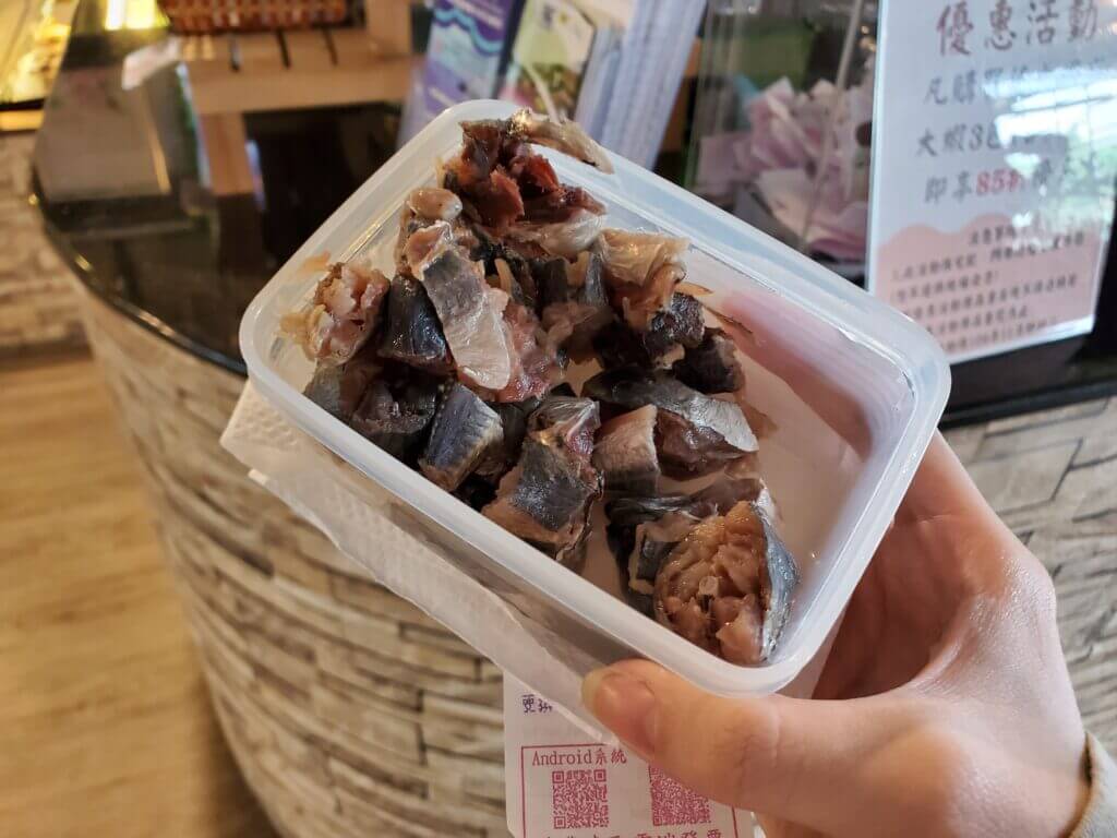 兩池的飼料都可以在座位區櫃檯購買,一份都是100元,剛好用門票折抵,鯉魚的飼料就是常見的魚飼料,而肉食性魚種的飼料則是處理過的魚塊,味道非常腥