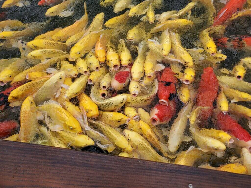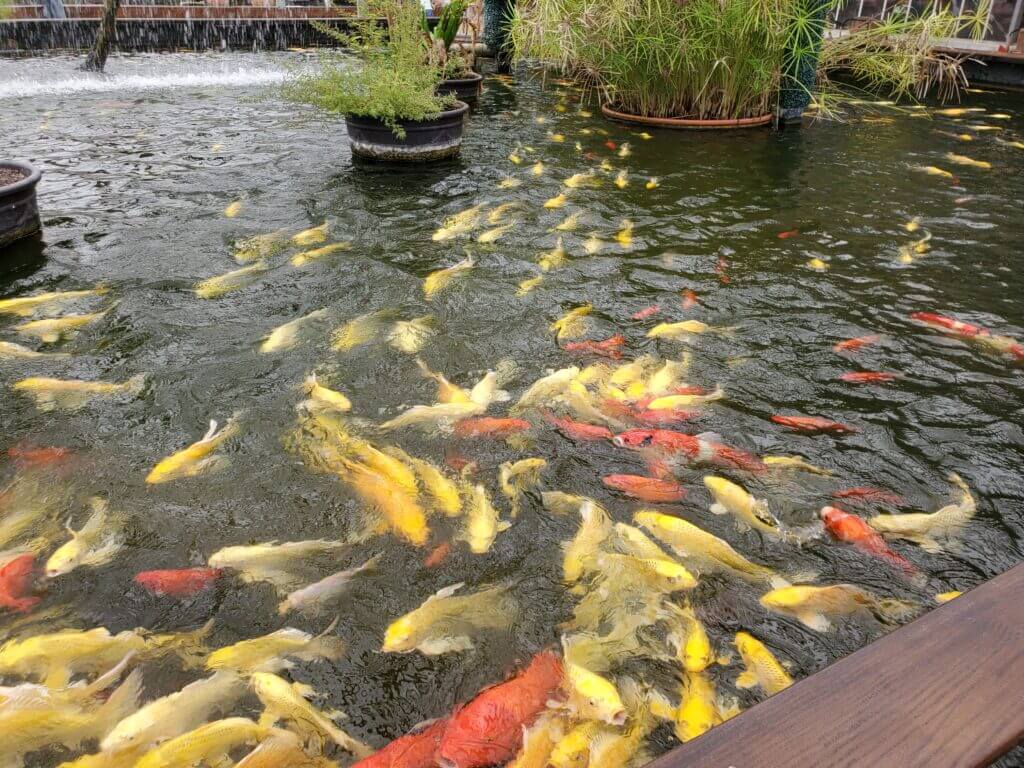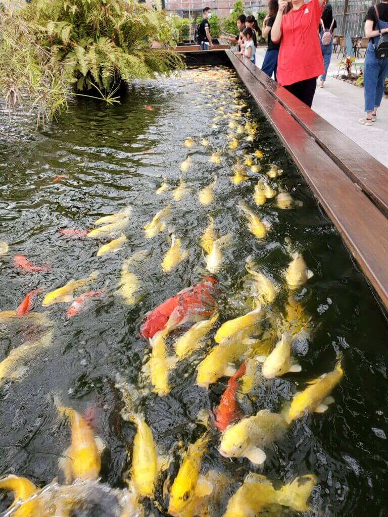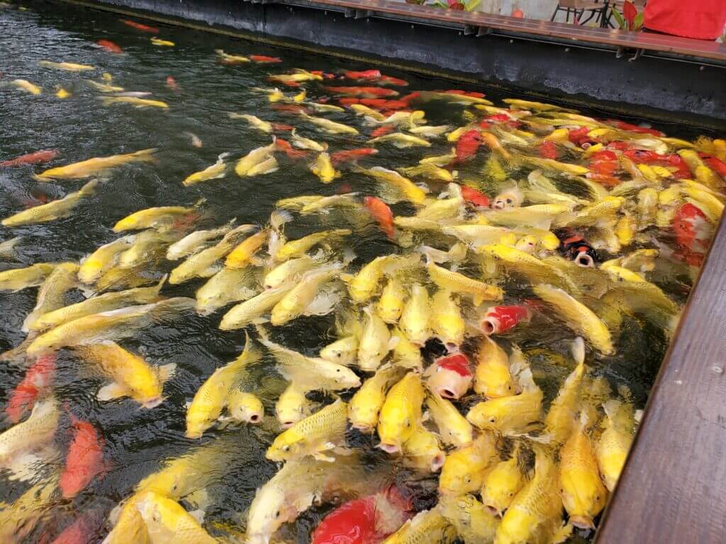 當天餵鯉魚的時候發現,換一個位置繼續丟魚飼料,鯉魚們會很有默契的一個接著一個來,看起來就像是一起排隊來吃飯的樣子,真是太有趣了