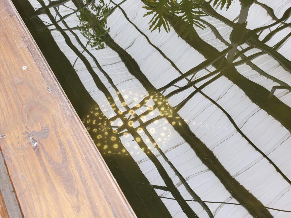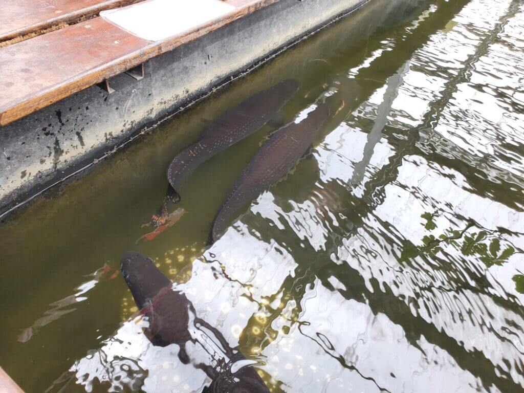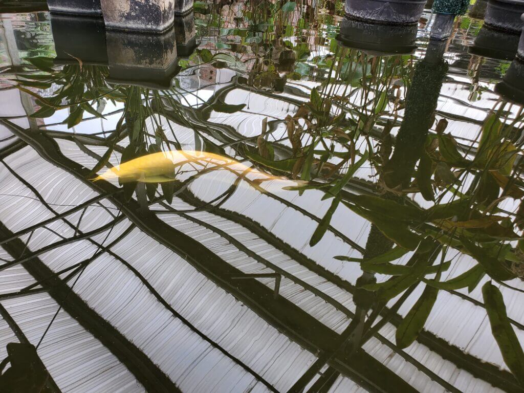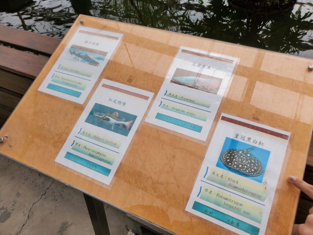 餵完鯉魚池後,我們轉戰肉食性魚種的池子,這一個池子看起來風平浪靜,繞了一圈只看到了一隻金色的龍魚在游,不過定睛一看,其實其他魚種也都在池子裡,只是靜悄悄的