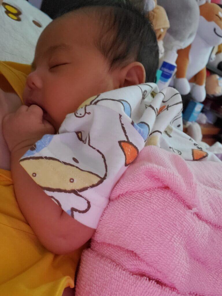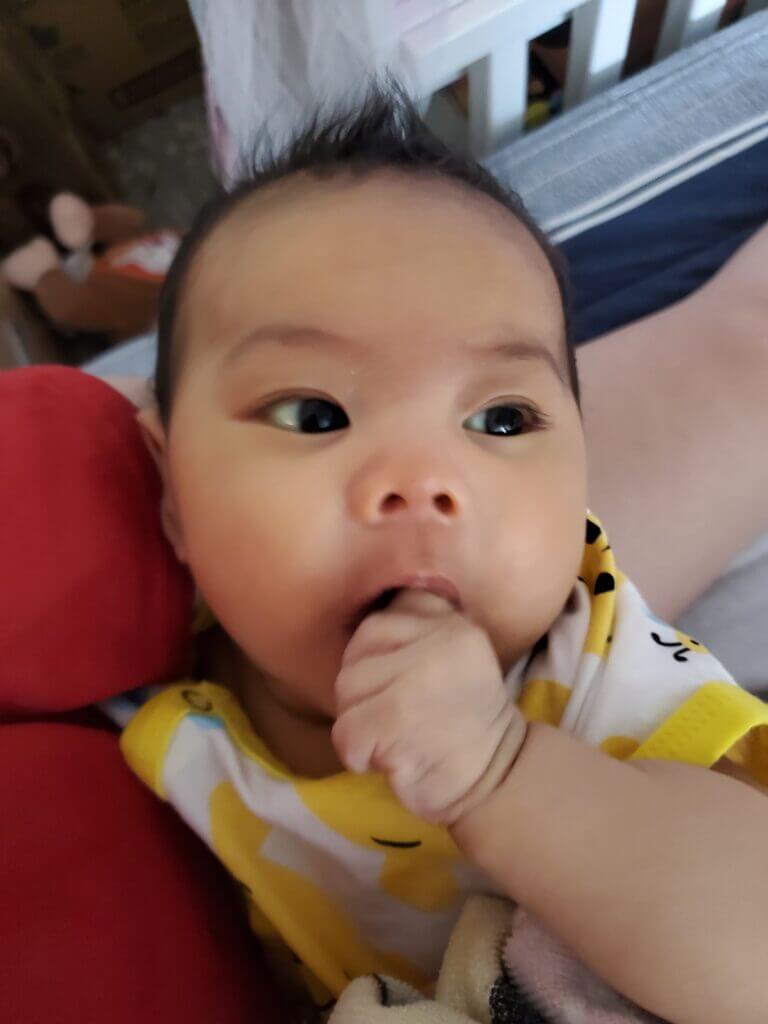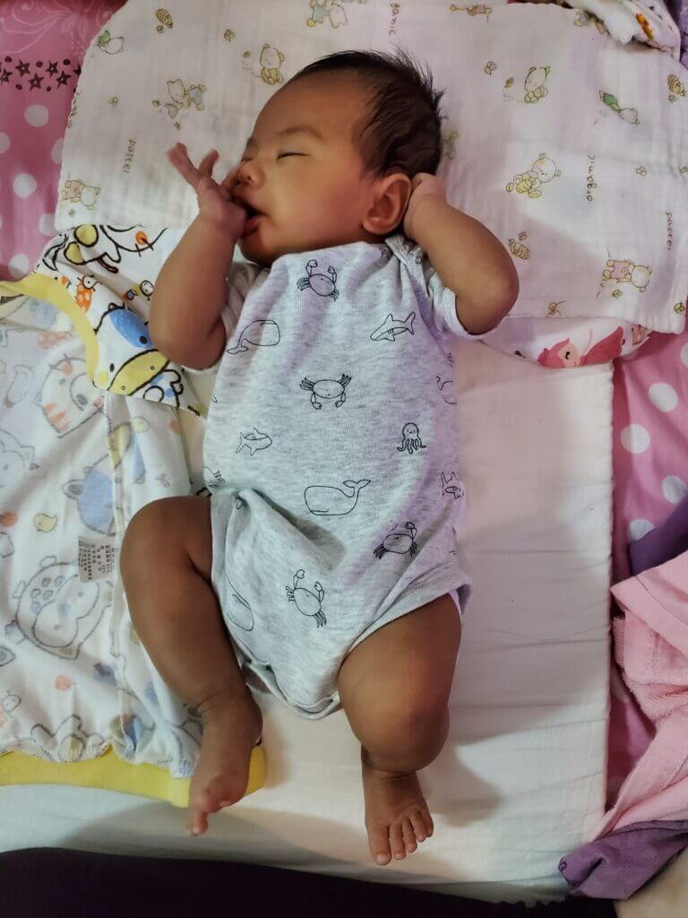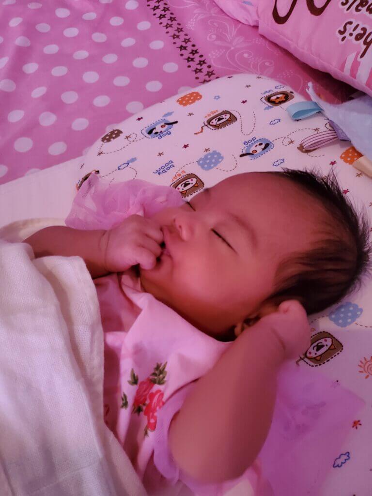 果不其然,半夢半醒的媛媛好像發現了什麼好物一樣,開始吸吮,吸個沒幾口就又自己睡著了,登愣 難不成她已經學會了吃手手安撫自己了嗎!