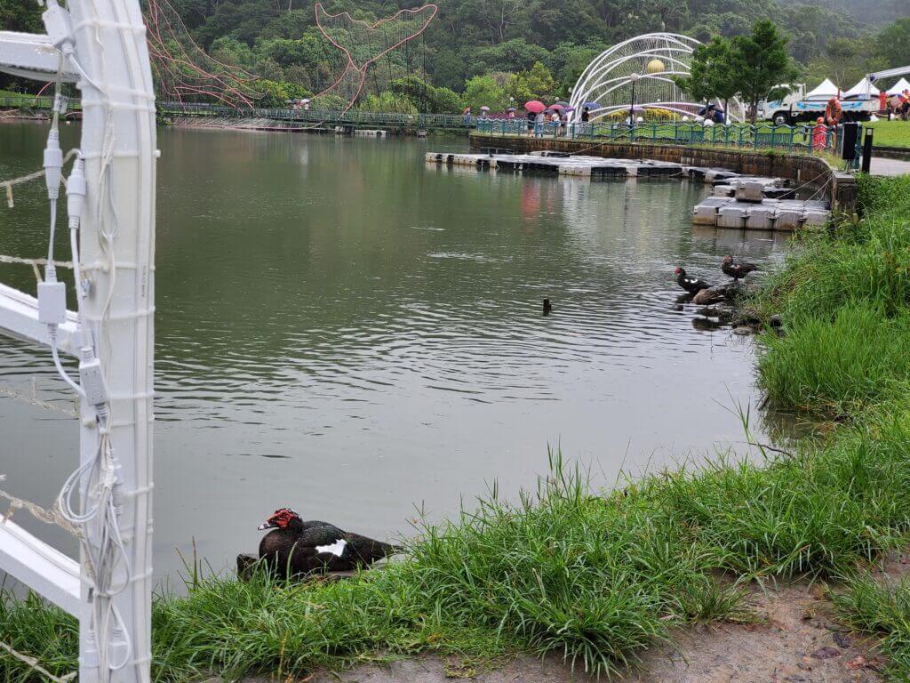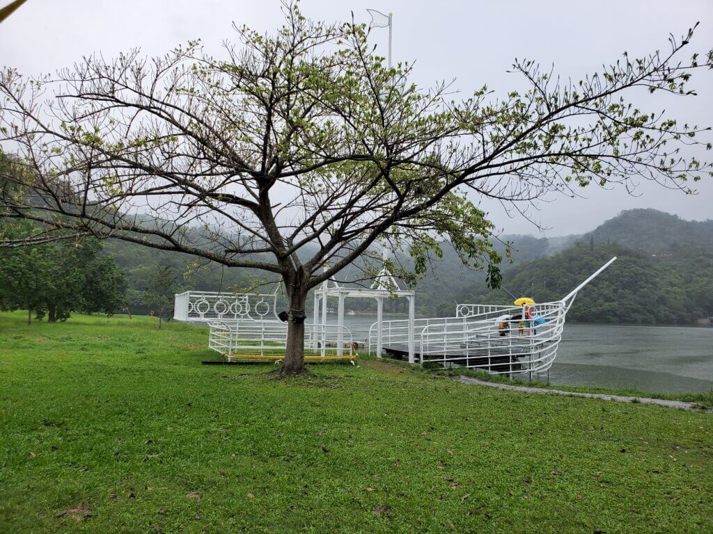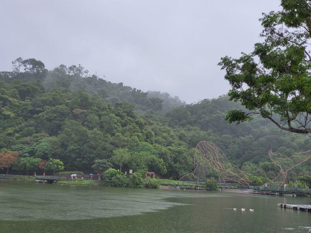 龍潭湖的風景很美,再加上下雨濕氣較重,遠方的山峰有雲霧繚繞,還有幾隻鴨子休息、滑水,在岸邊還有幾個裝置藝術可以讓大家拍照,裝置藝術上有纏繞燈泡,應該是到了晚上會有點燈吧
