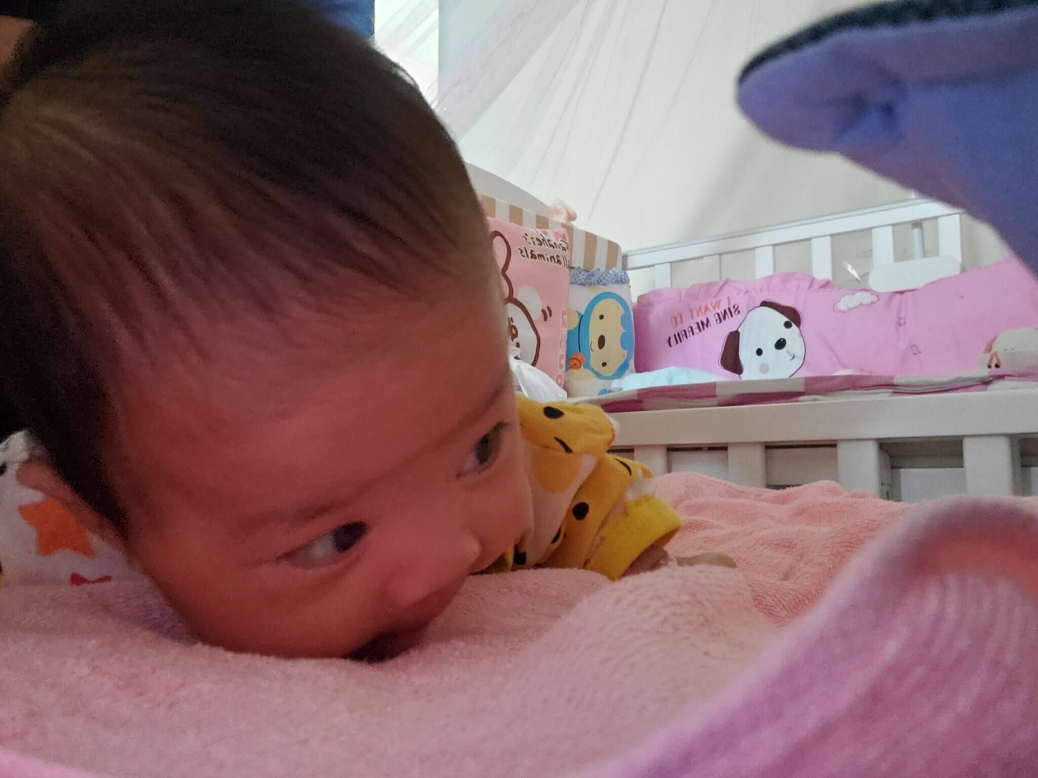 從這一次之後,只要幫媛媛翻過來,她的頭都抬的高高的,心情看起來也很好,努力抬起頭來看世界的樣子真的好可愛哦~
