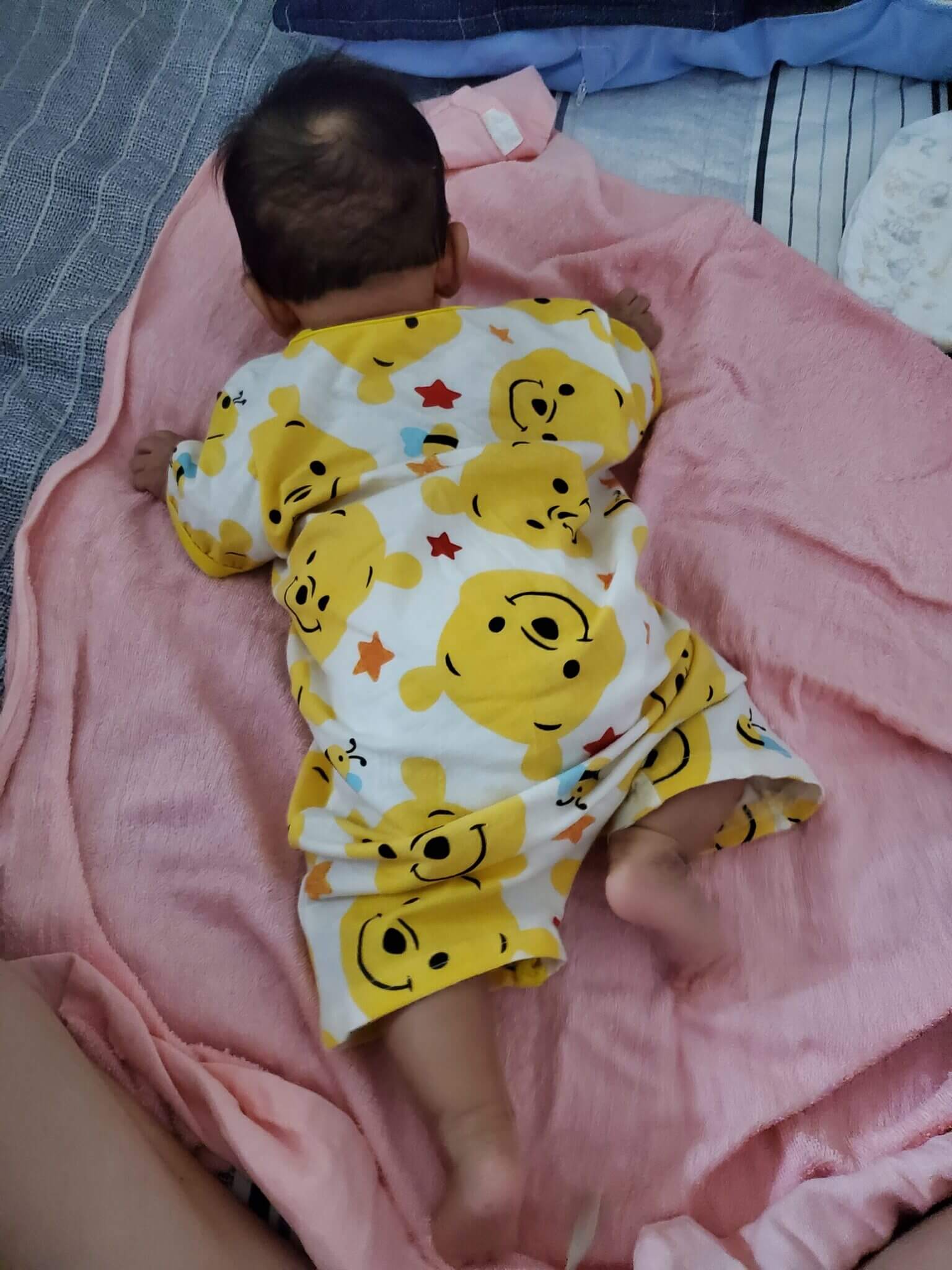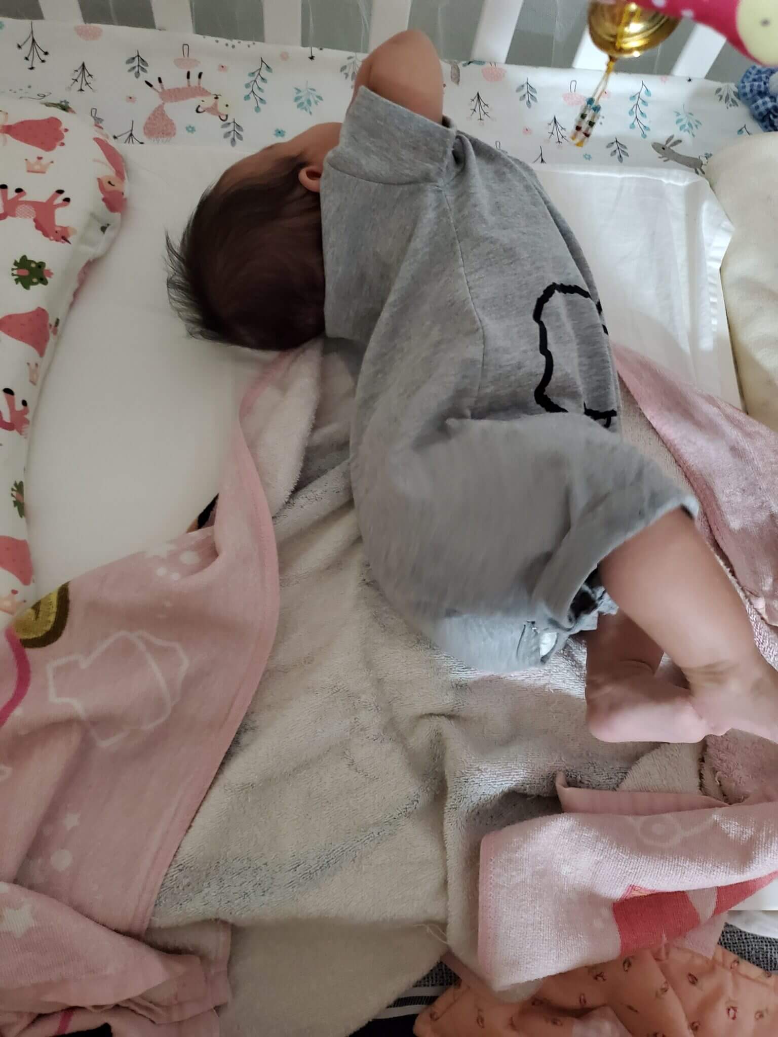 可是等到兩個多月的時候,不知道是不是頭太重還是太懶了,幫媛媛翻過去以後,她的頭就一直抬不起來,就在床上蹭來蹭去,我也把她當作是太累了不想抬