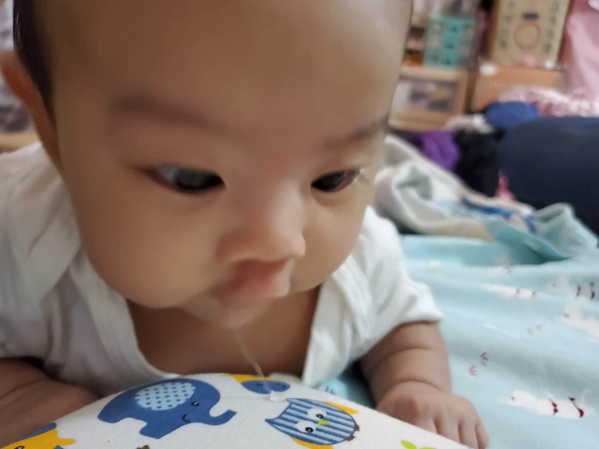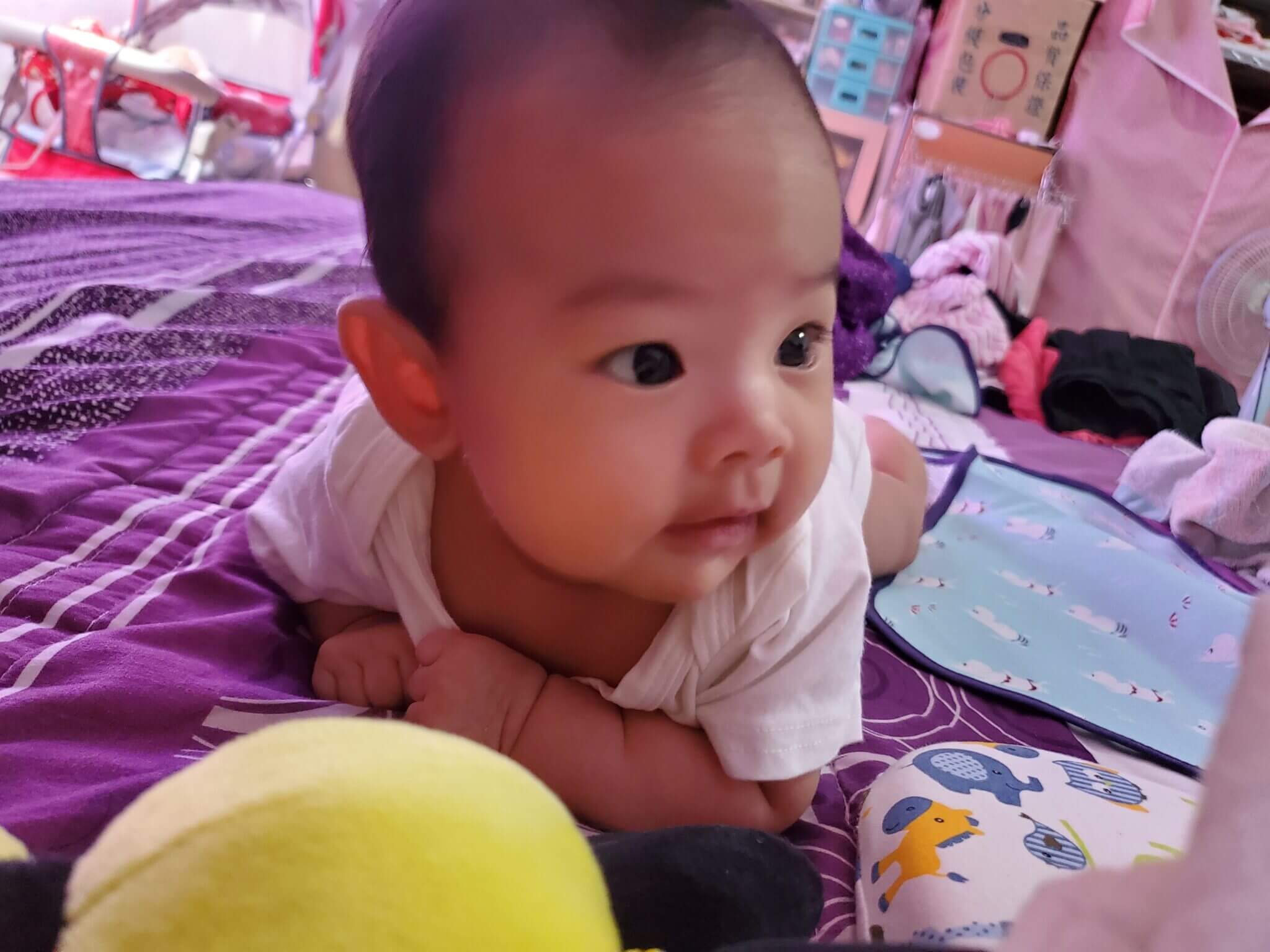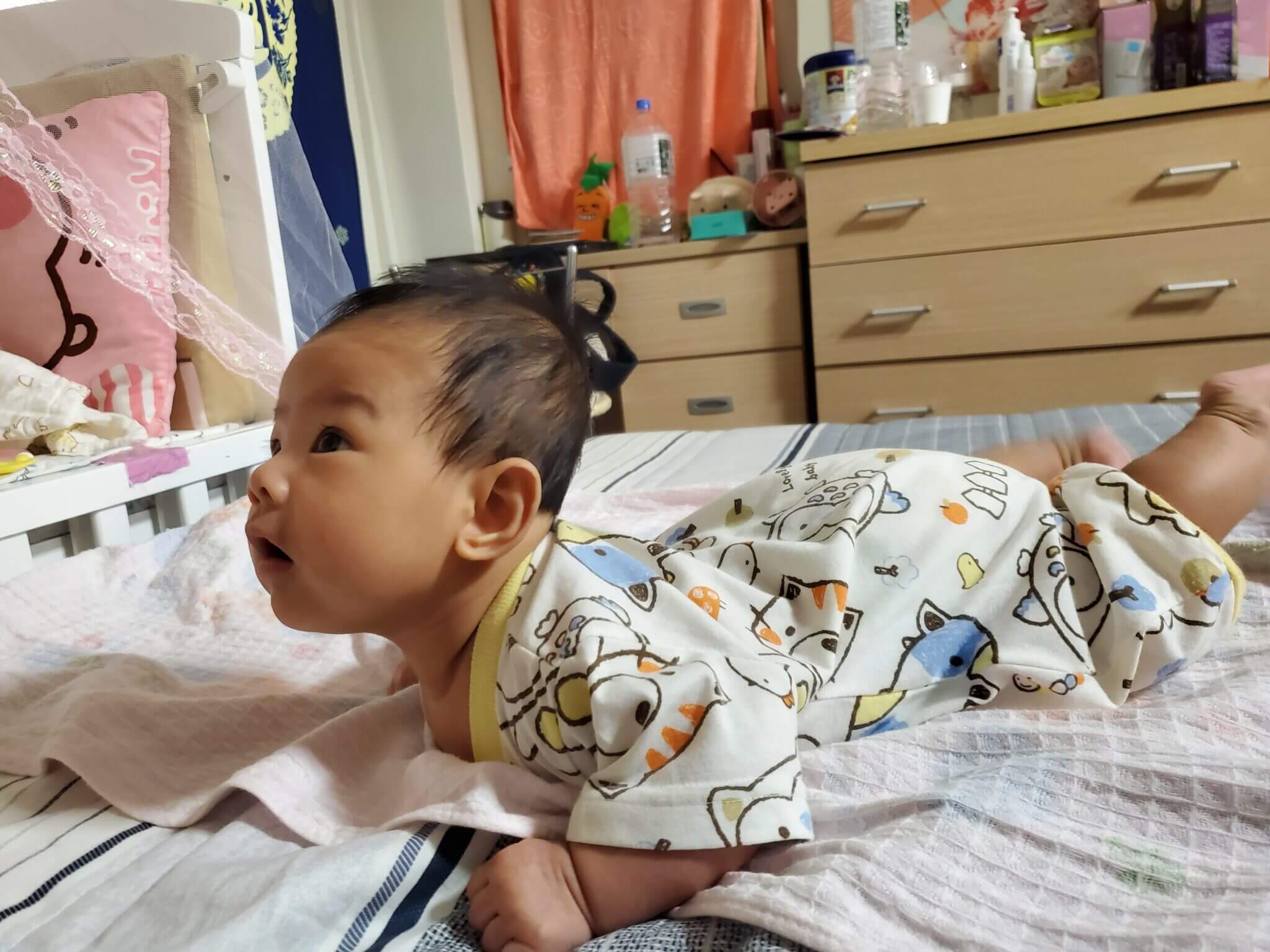 雖然學會翻身是一件很棒的事情,但是半夜常常要把自己翻過去又沒辦法繼續睡而在哭的小孩安撫,真的是很痛苦啊,還好大約1個禮拜以後,這個情況就好轉了,真是可喜可賀哈哈哈