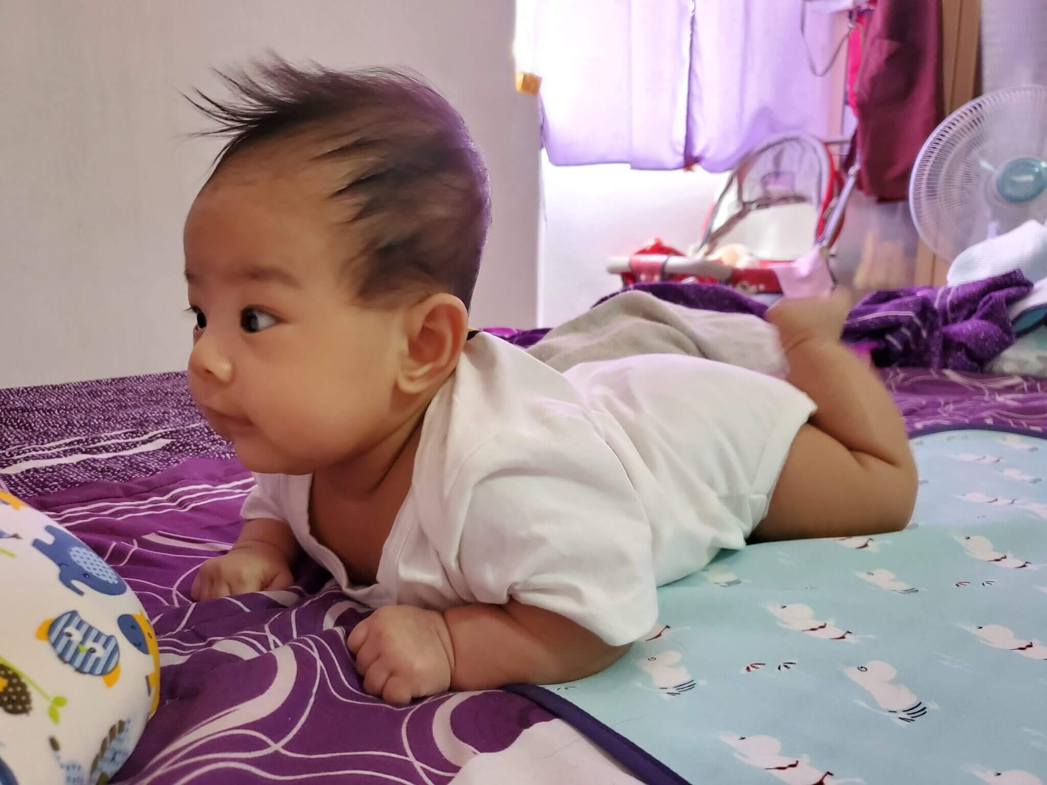 依照寶寶手冊上的的粗動作發展1、2個月大的時候,寶寶可以將頭稍微抬起,到了3個月大時,則可以抬45度,而五個月時,則是應該會翻身了