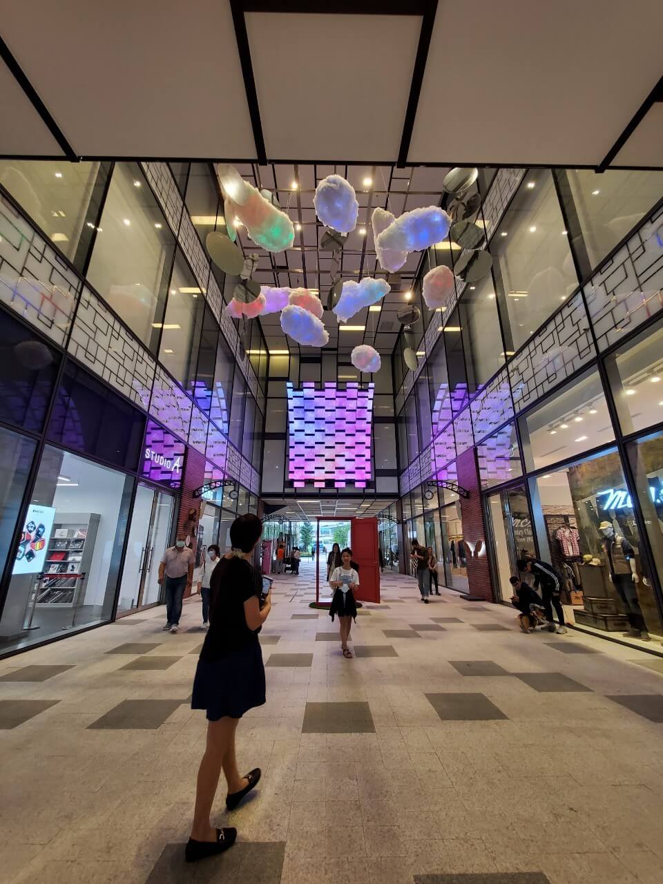 在1樓的廣場有很多可以拍照取景的地方,像是天花板上有懸掛雲朵藝術裝置,各種顏色轉換,挺漂亮的,牆壁上不同樣子的時鐘、翅膀、路標指引還有任意門等等,都可以在這裡拍幾張漂亮的照片