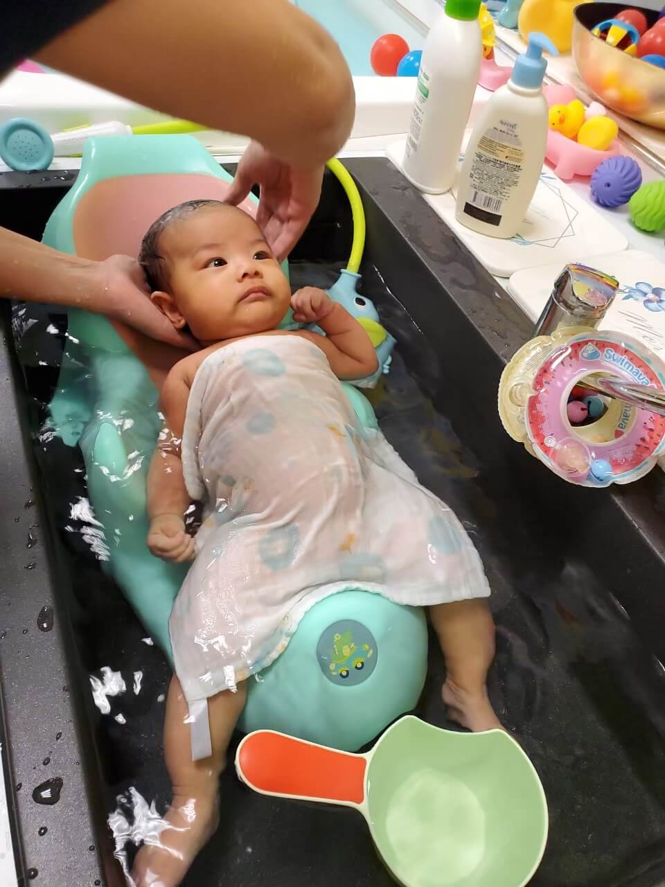 話說這個洗澡的凳子看起來不錯用耶,不用一直抓著小寶寶,感覺會輕鬆很多