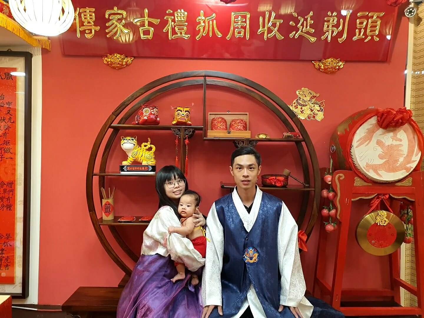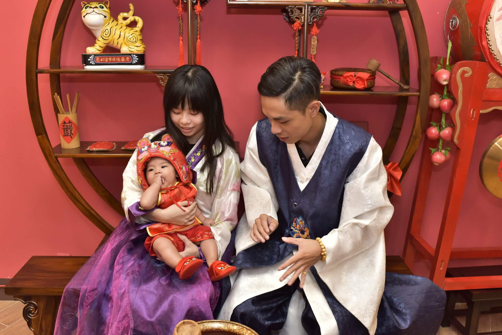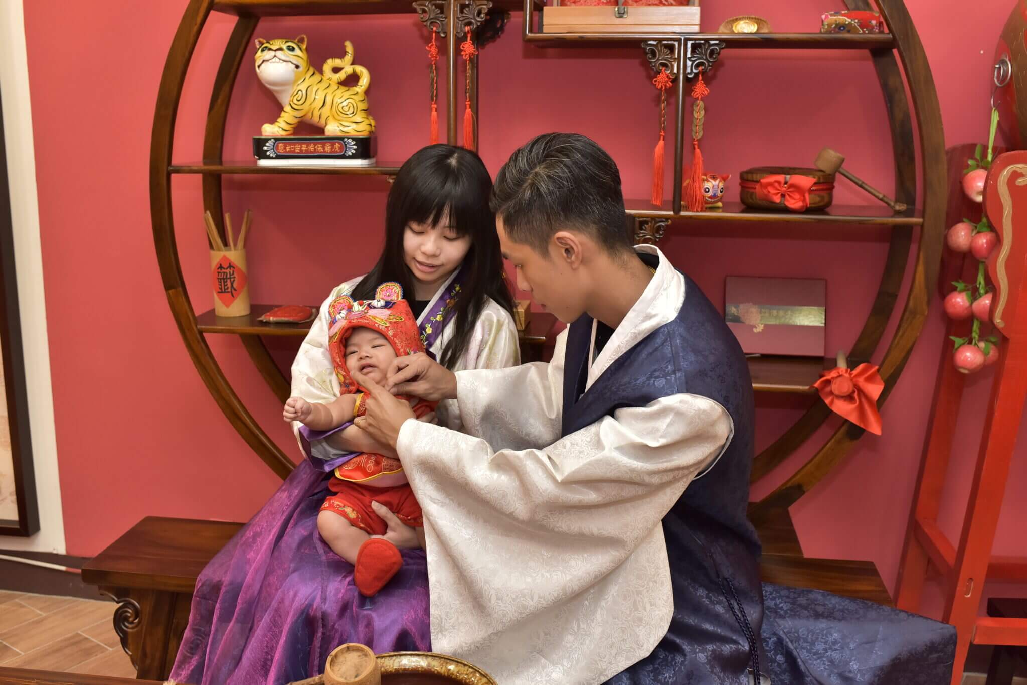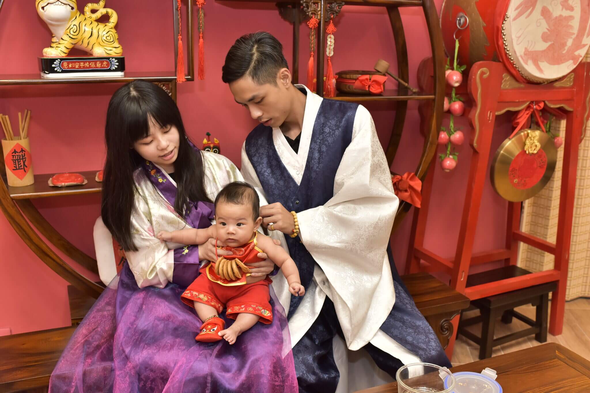 雖然說是附贈的收涎儀式,但是整體也不馬虎耶,可以讓寶寶和爸媽換上不一樣的衣服進行整體儀式,還有工作人員幫忙拍照和帶領,看見掛在更衣間的小肚兜,就決定讓媛媛換上