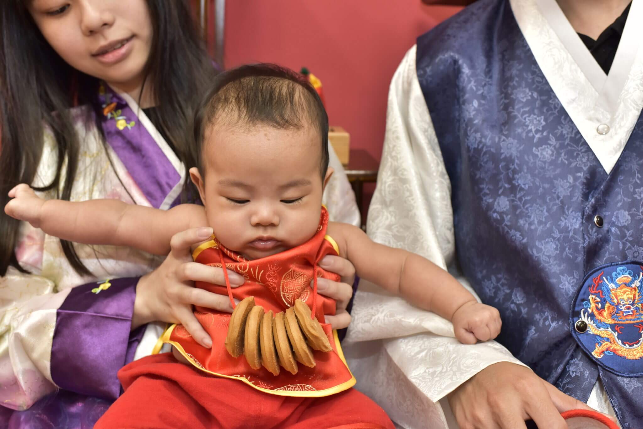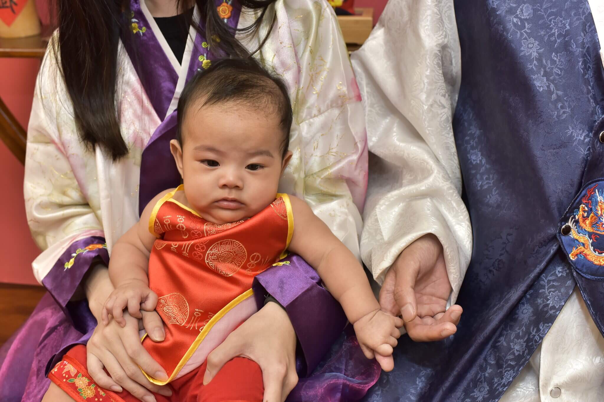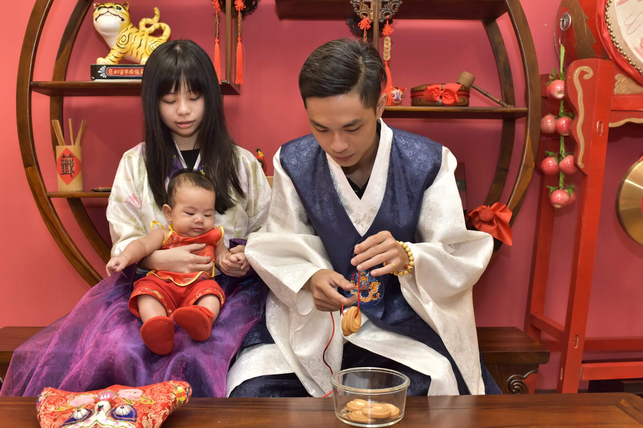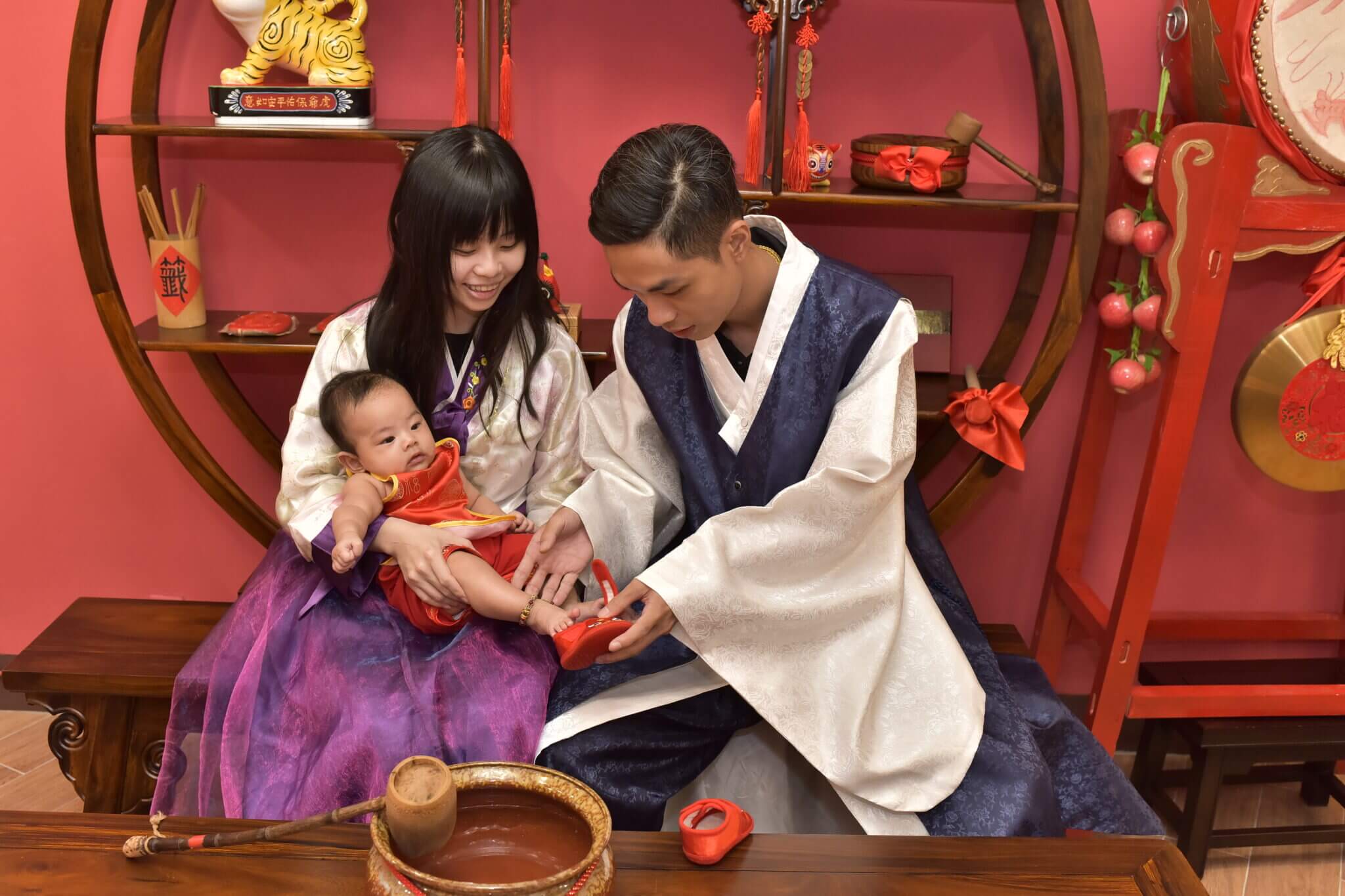 雖然說是附贈的收涎儀式,但是整體也不馬虎耶,可以讓寶寶和爸媽換上不一樣的衣服進行整體儀式,還有工作人員幫忙拍照和帶領,看見掛在更衣間的小肚兜,就決定讓媛媛換上