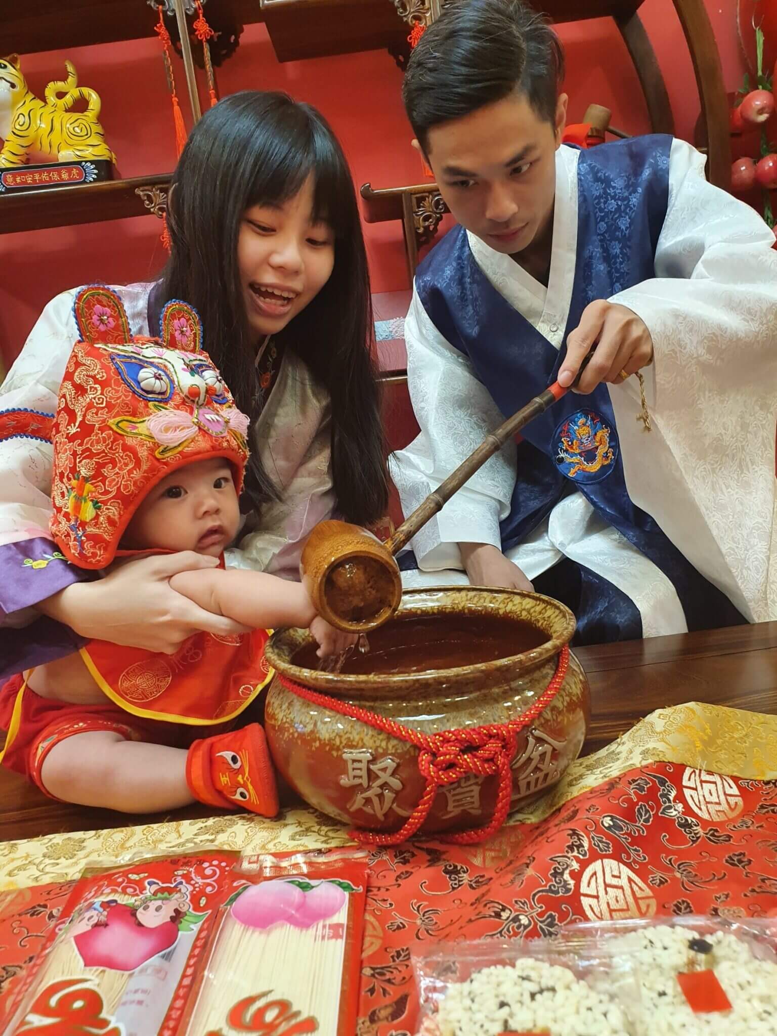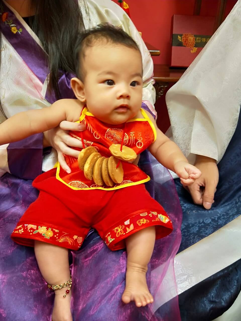 其實整個收涎儀式也很簡單,和滿月剃頭一樣,有平安米、長壽麵等等,意思在於保佑他平平安安長大,但是多了穿虎鞋戴虎帽這一個流程