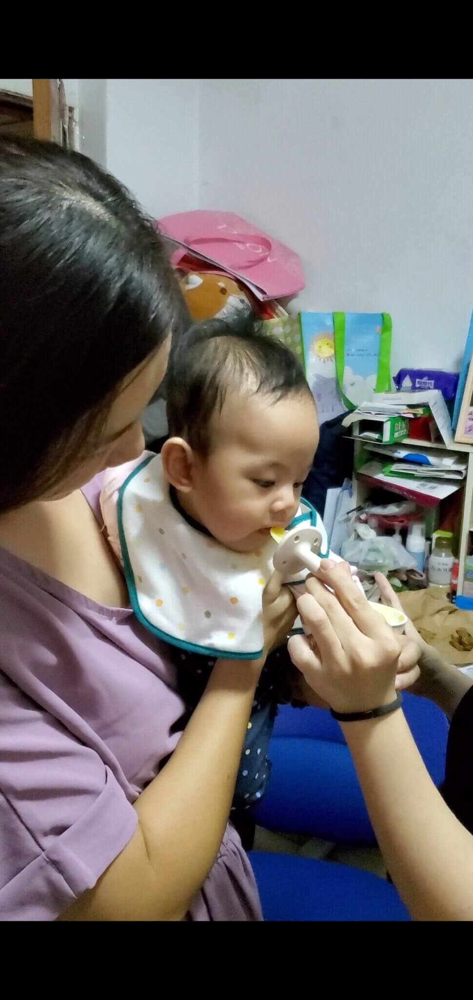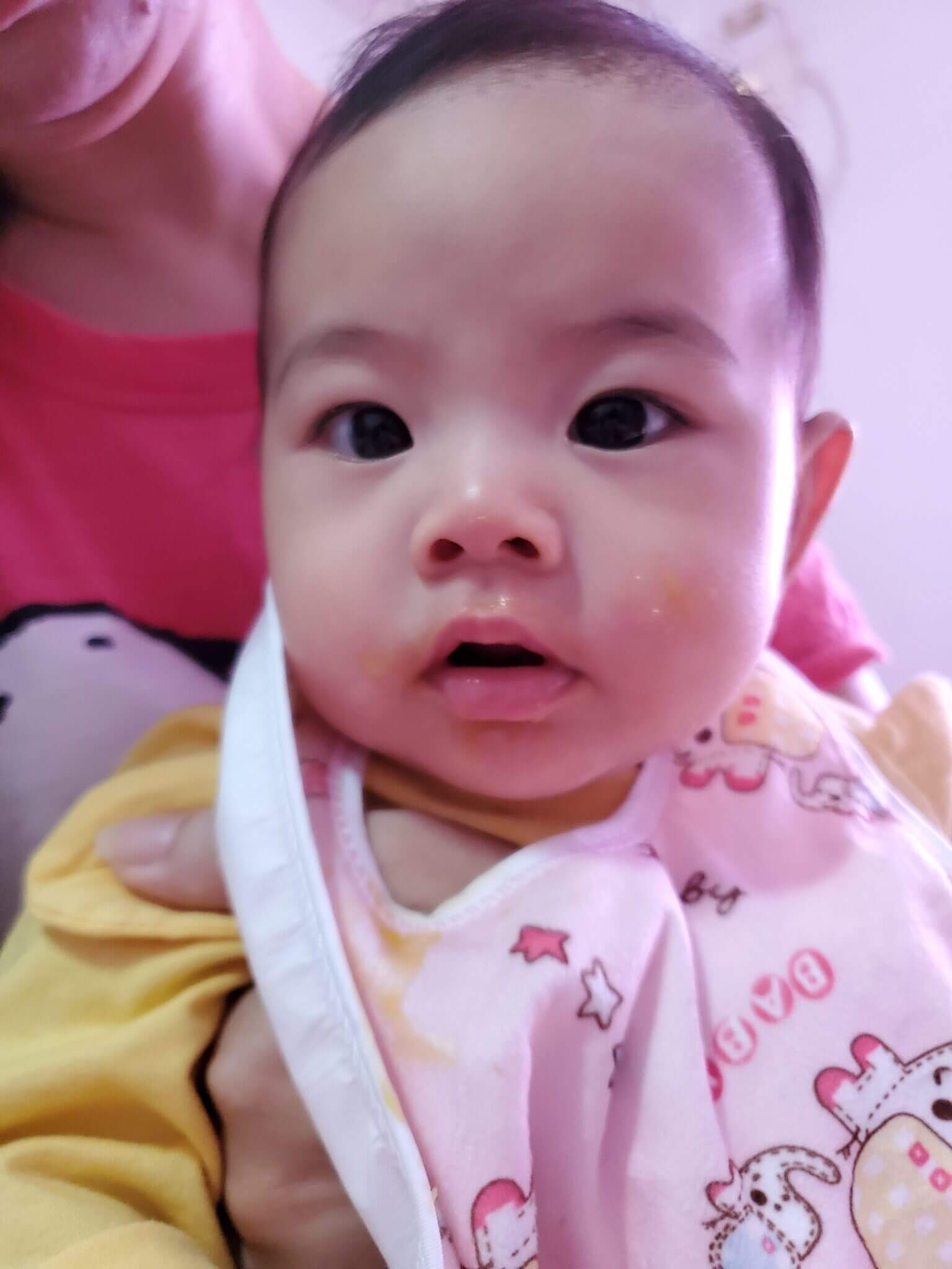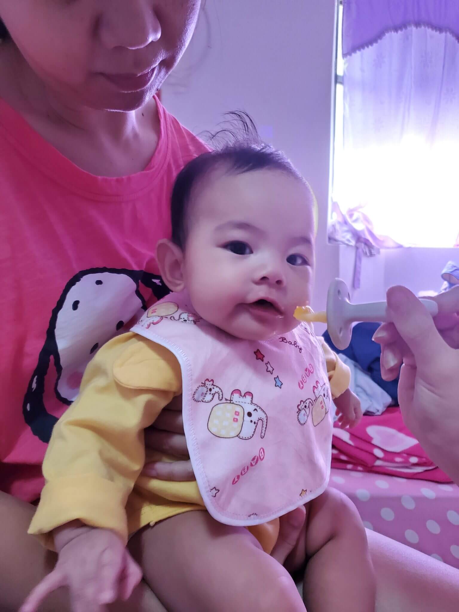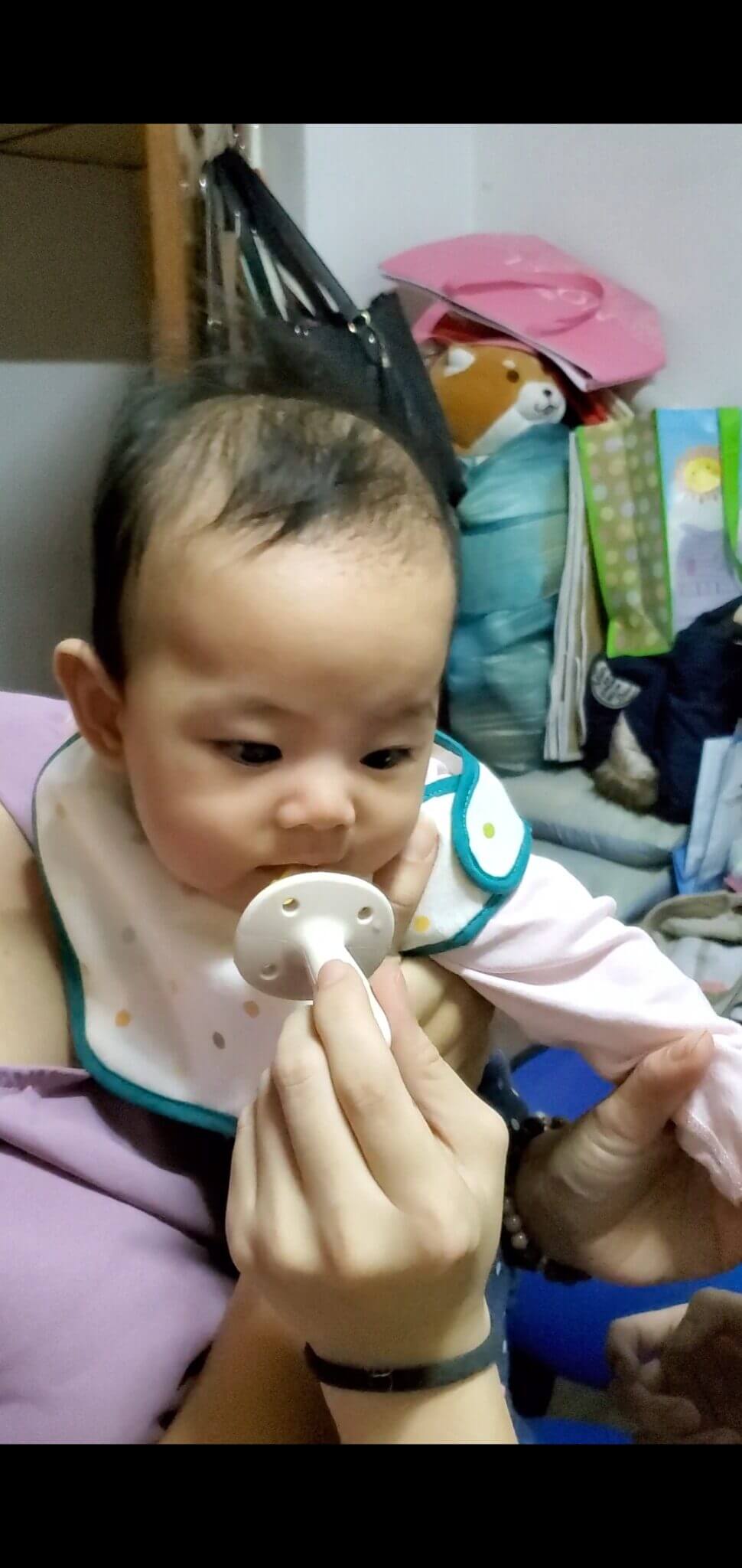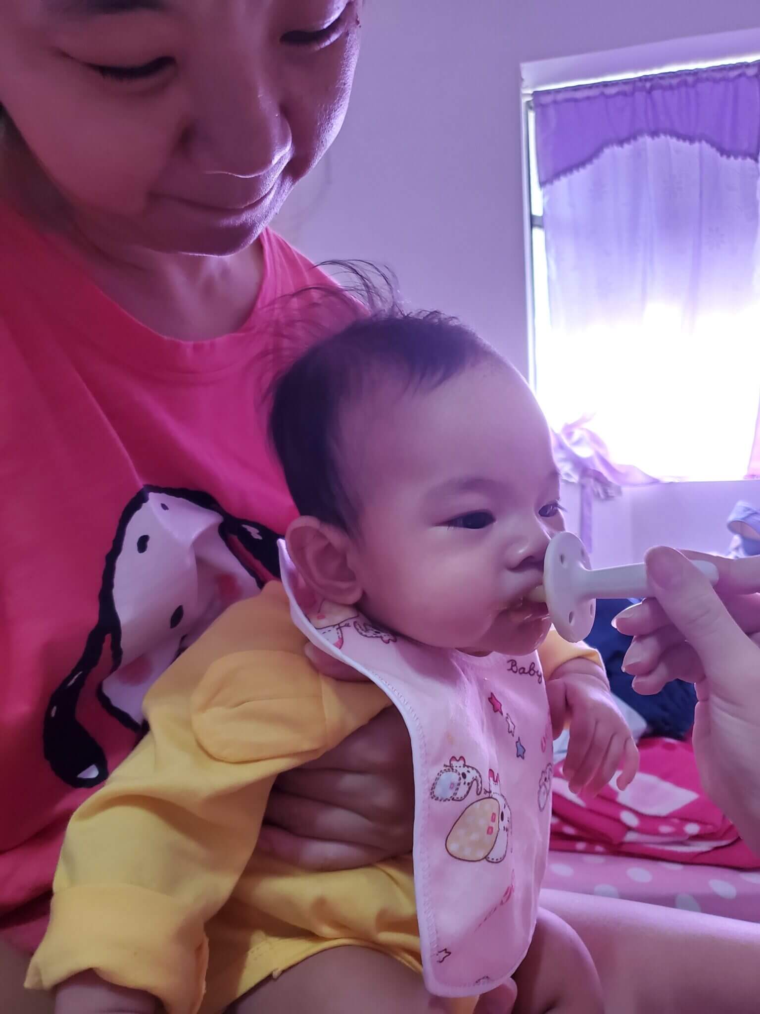 不過媛媛沒有把她吐出來其實讓我蠻意外的,因為網路上有很多媽媽分享,寶寶的第一口副食品百分之九十會吐出來,媛媛雖然皺了眉頭也還是吃下去了