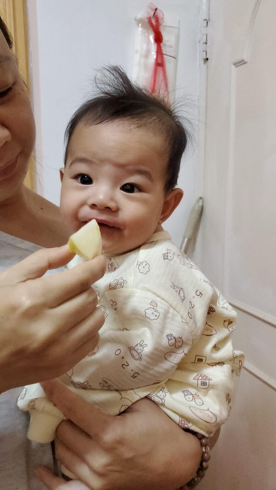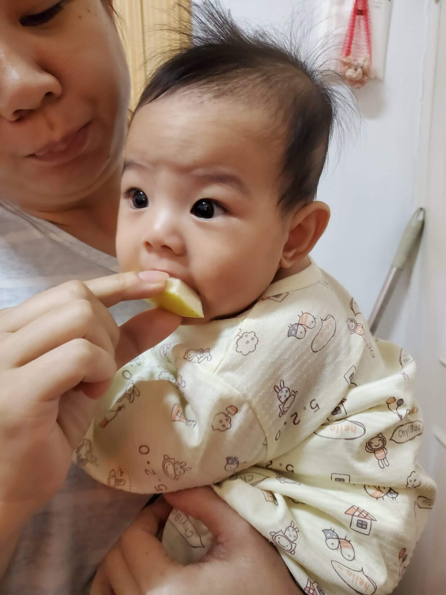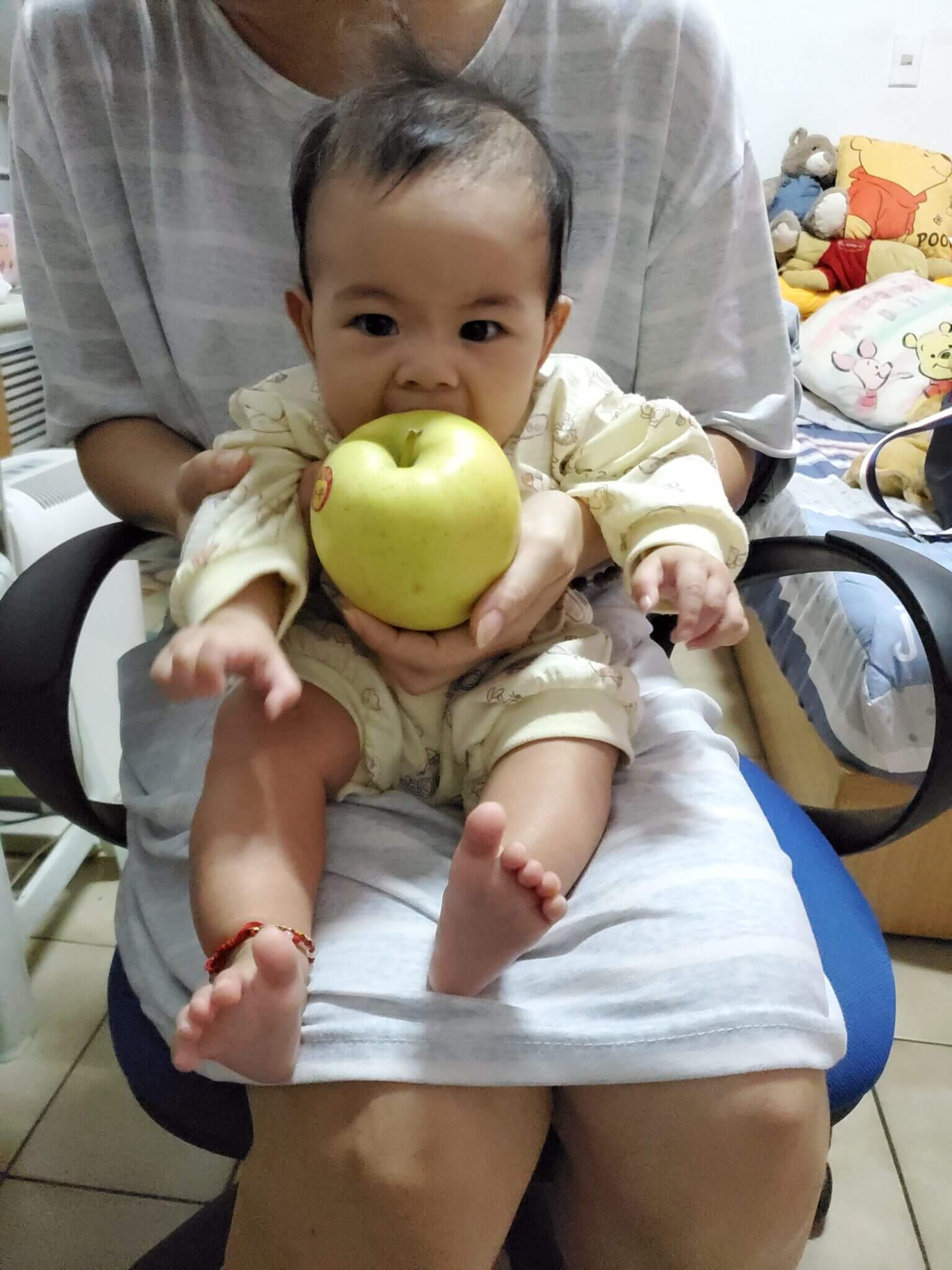 有一天,媽媽買了很甜的蘋果回來,我在切的時候想著醫生說過只要不加鹽不加蜂蜜還有堅果,剩下的都可以嘗試看看,不過家裡沒有磨泥的機器,就直接拿著整塊讓媛媛吸讓她嚐鮮看看(這是不好的示範)