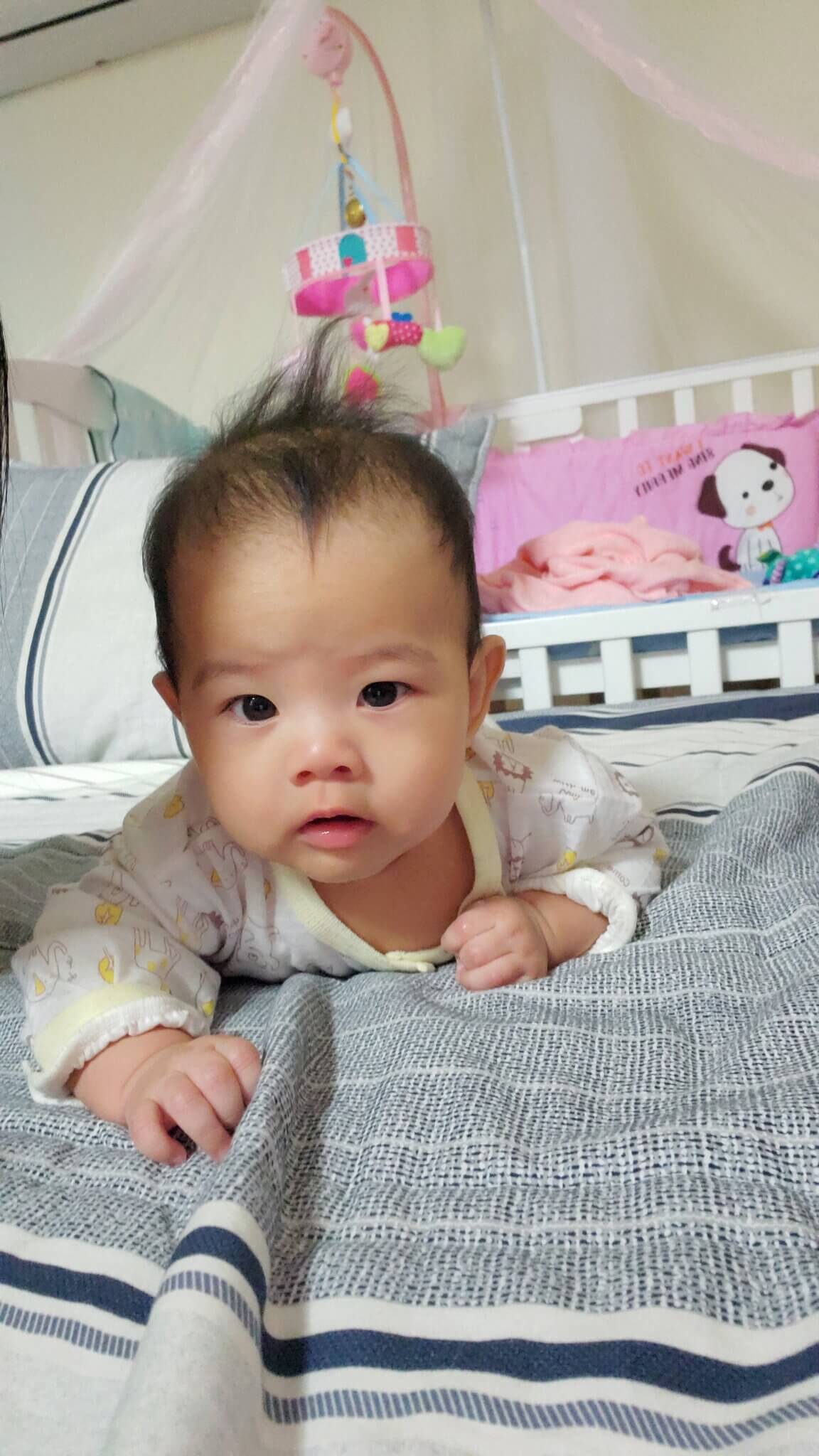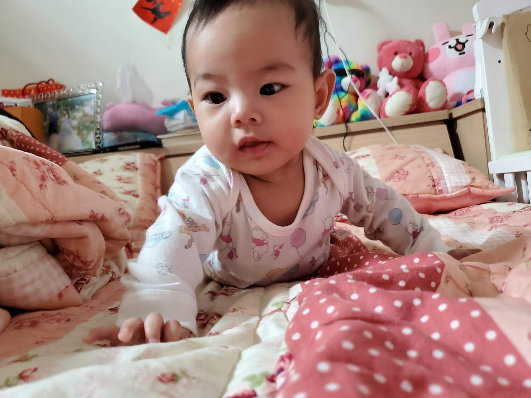 只要有小孩的爸媽一定都聽過一句話:七坐八爬九長牙,媛媛從4個月開始就會一直用頭去蹭,屁股抬的高高的前進,每次看她這樣我都很擔心她的鼻子整個扁掉