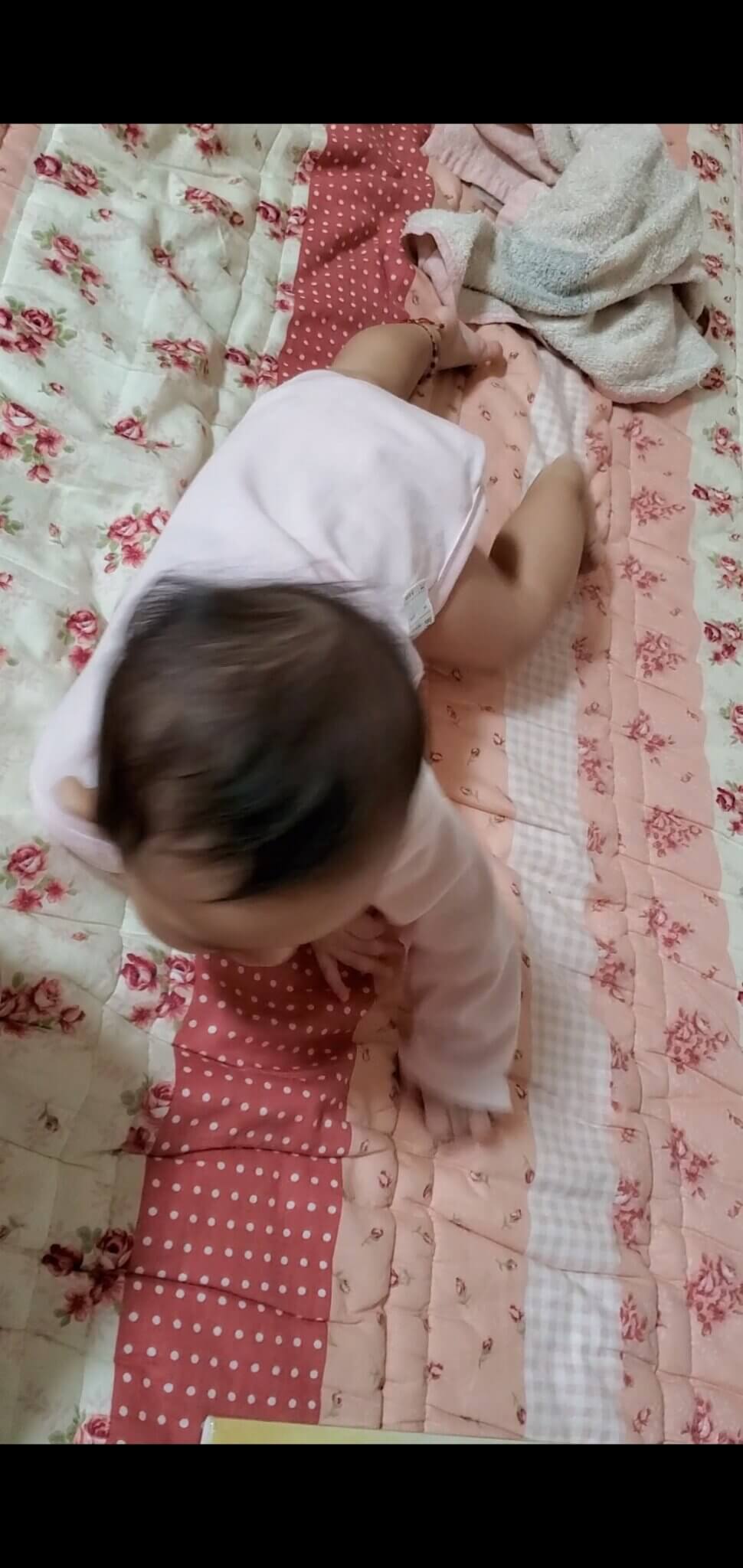 就在有一天,我又嘗試著將媛媛上半身抱起,讓她手和腳著地呈現跪姿,但是這一次不同的是,媛媛的手竟然也開始慢慢向前,不過她的腳動的太快,手的速度還跟不上,有點手腳不協調哈哈哈