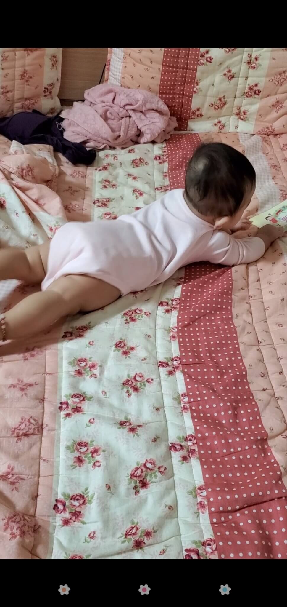 就這樣在媛媛勤奮的練習之下,到了6個月的那天,我們一如往常的在床上玩,媛媛看到了她的寶寶手冊,沒想到 她為了拿寶寶手冊竟然是用匍匐前進的方式!!!
