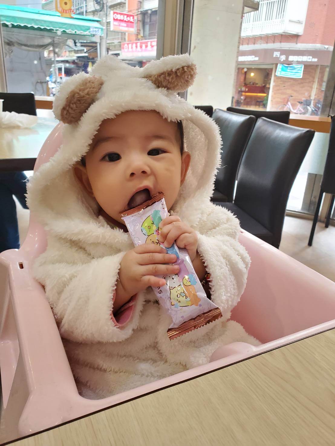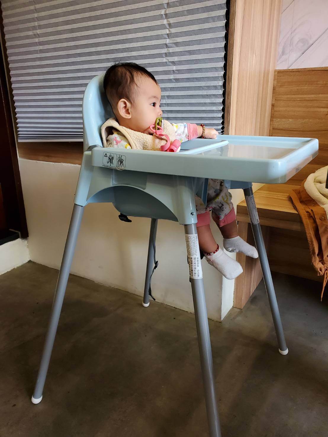 後來隨著媛媛越坐越穩,我開始嘗試出去吃東西的時候,如果有兒童餐椅就讓她坐坐看,不然沒推嬰兒車的時候,總是要抱著沒辦法好好吃飯啊 !!!