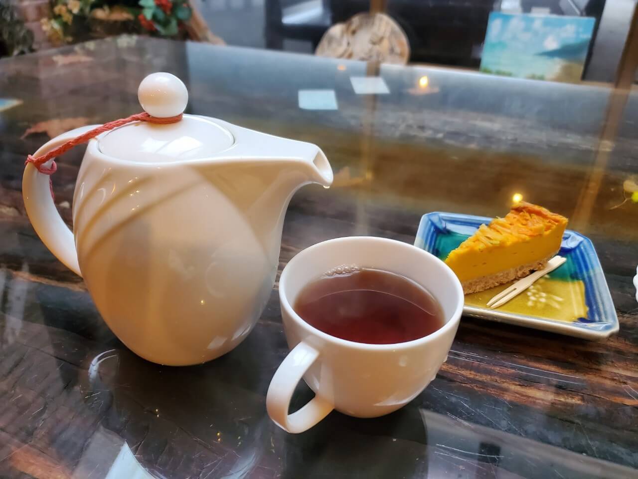 我們換到了小木屋這邊來享用我們今天的下午茶,我們點了一杯花草茶、咖啡還有一份厚片吐司,南瓜派是咖啡附贈的小點心
