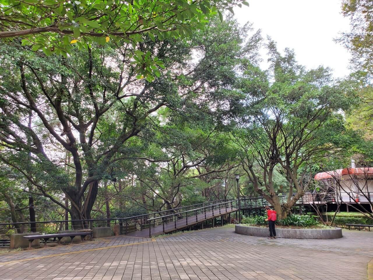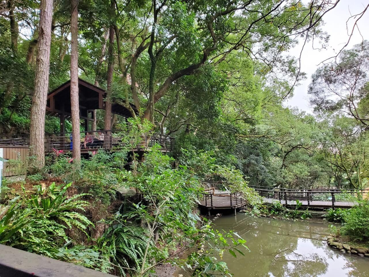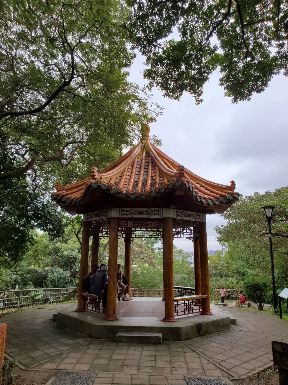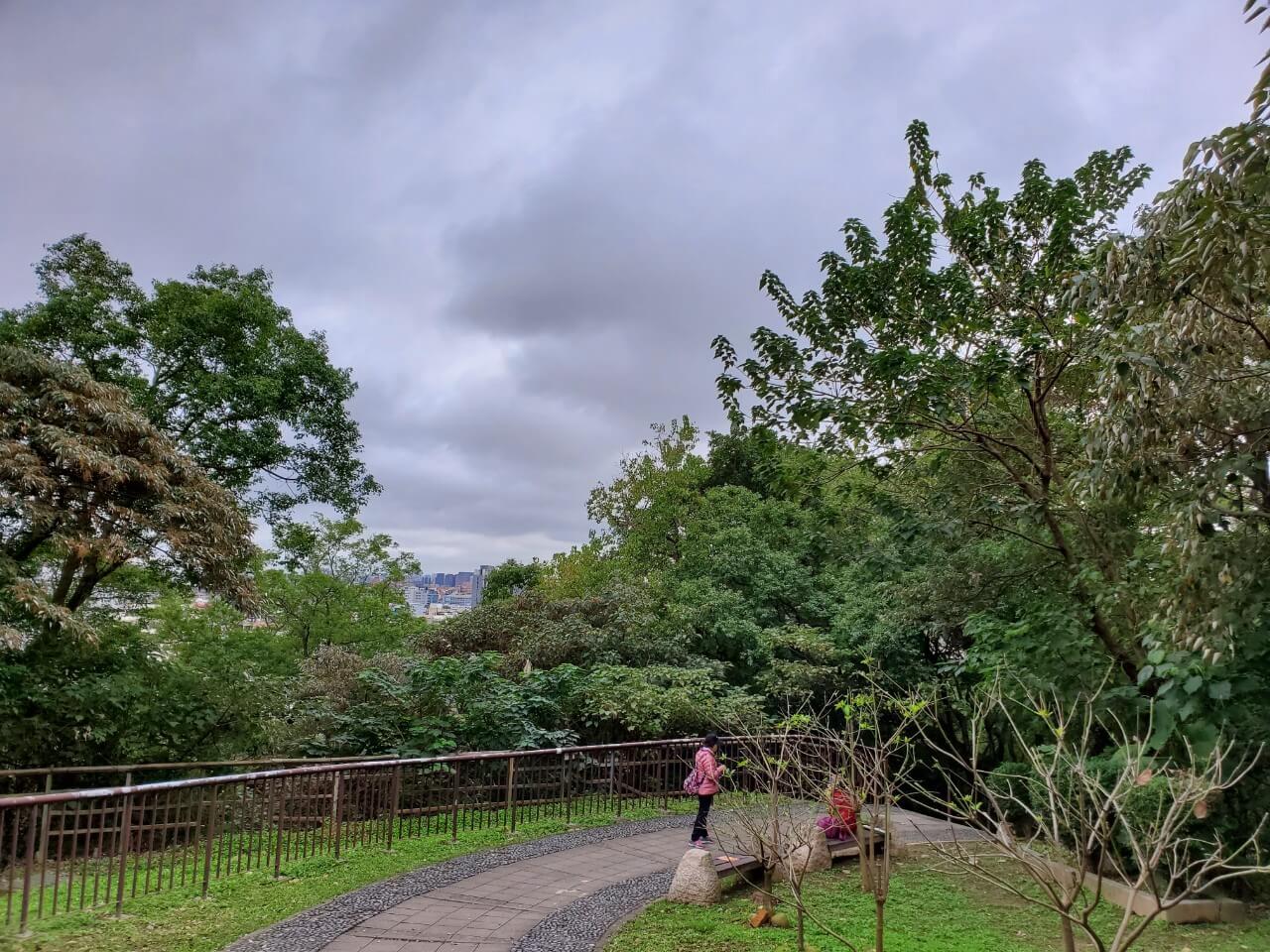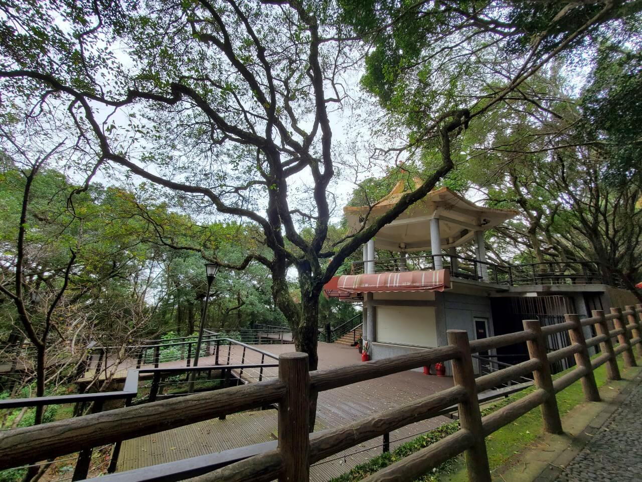 在這個中式涼亭前方,有一個類似觀景台的地方,隱約能看到視野挺不錯的,但是兩旁的樹長得又高又大,能看到的地方還真是有點少啊